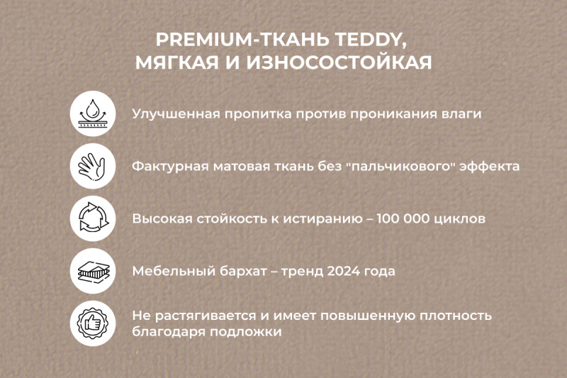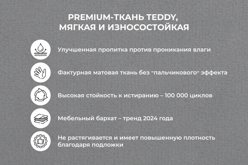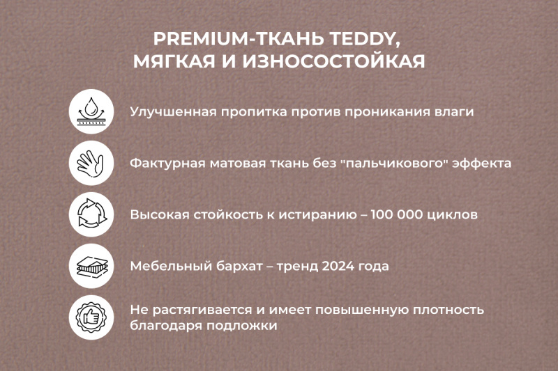 Мягкая обивка создает атмосферу уюта. При создании новинки мы использовали ткань велюр последнего поколения, отличающуюся такими свойствами как: ультра мягкость; повышенная износостойкость, за счет инновационных методов производства; легкая чистка.
