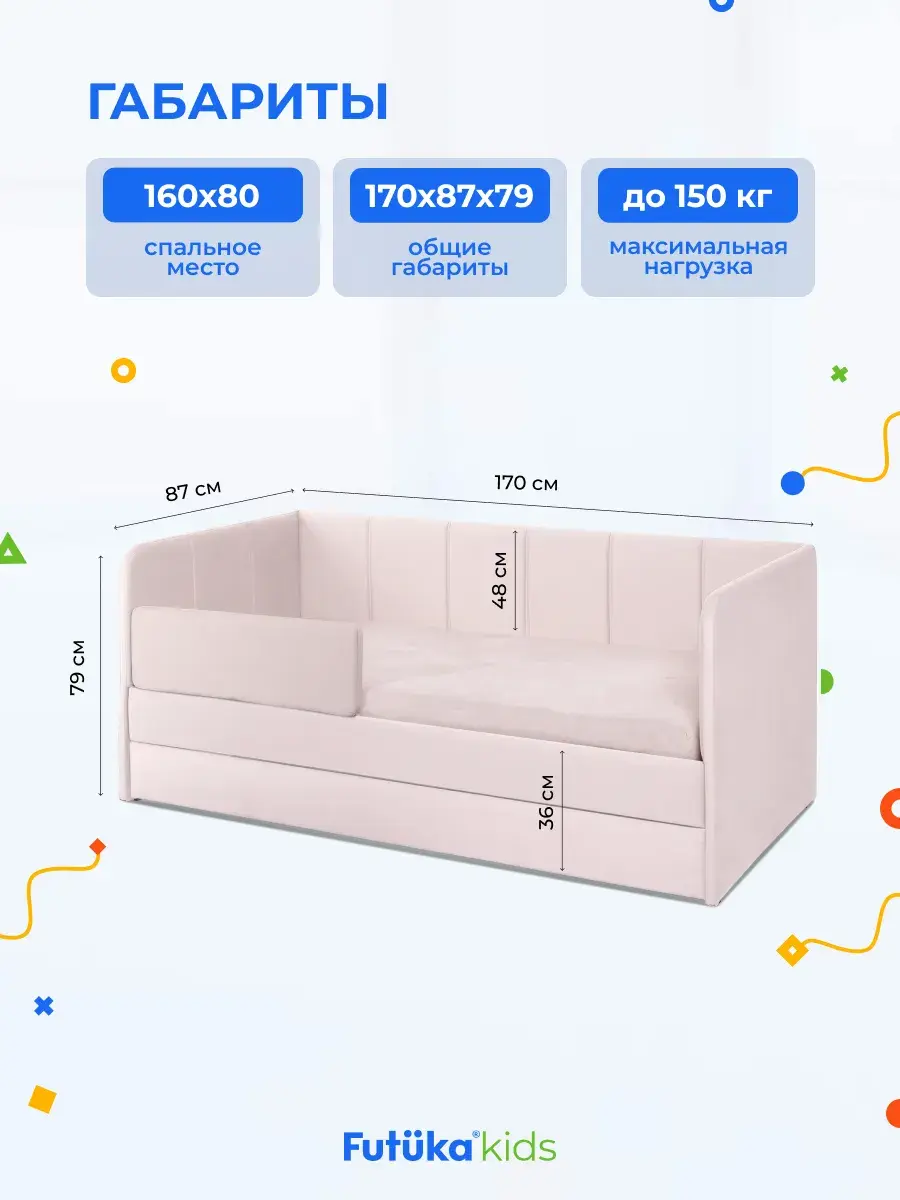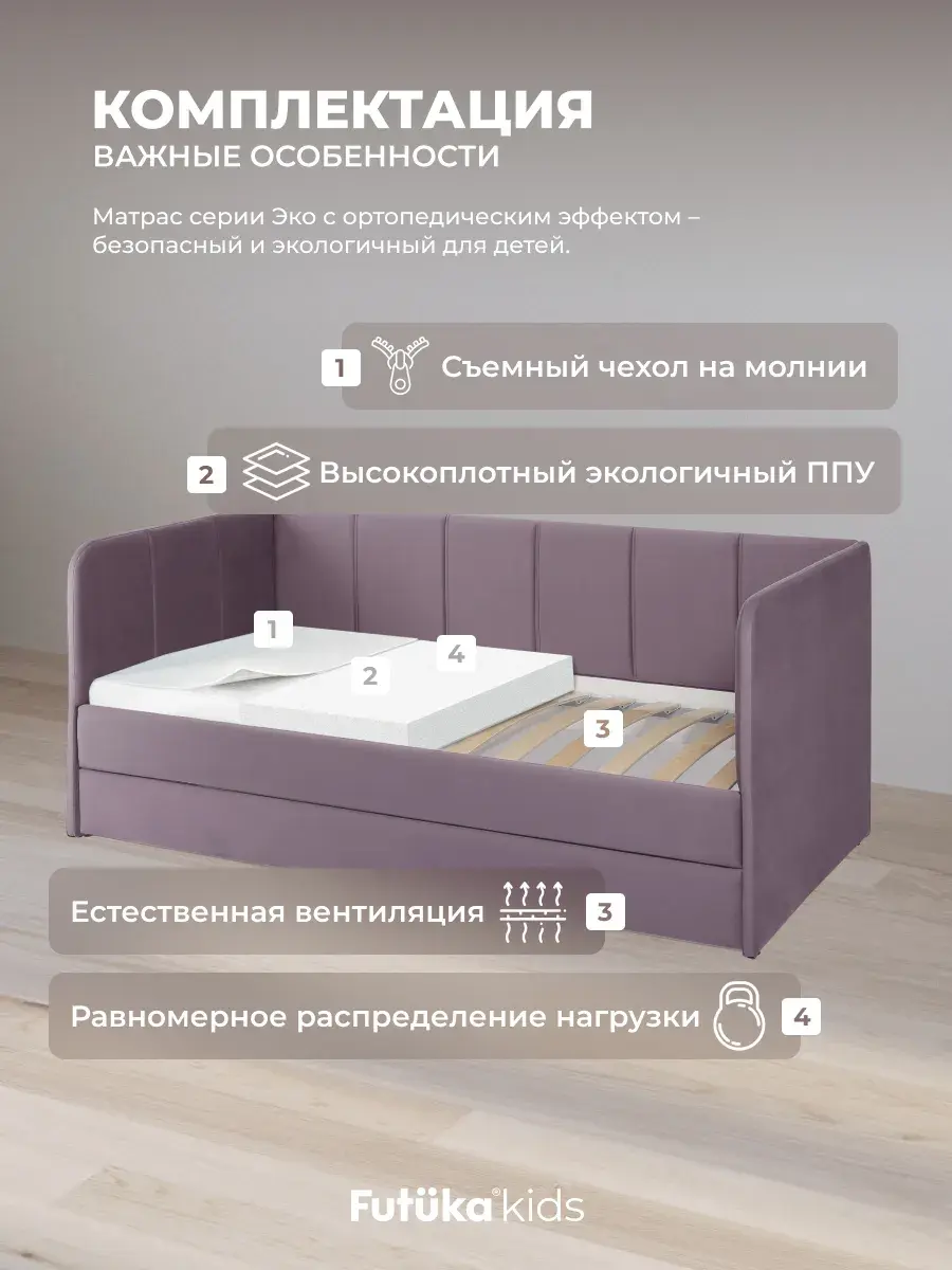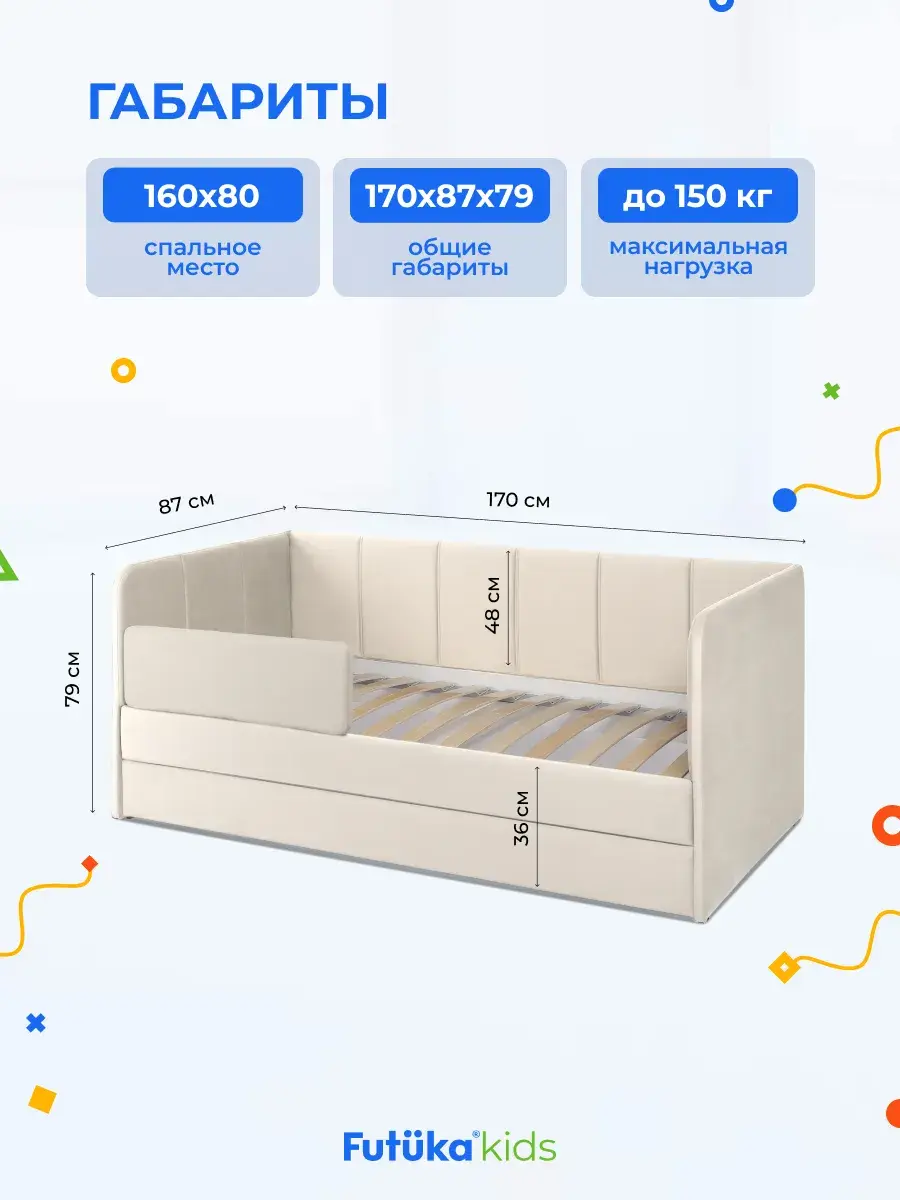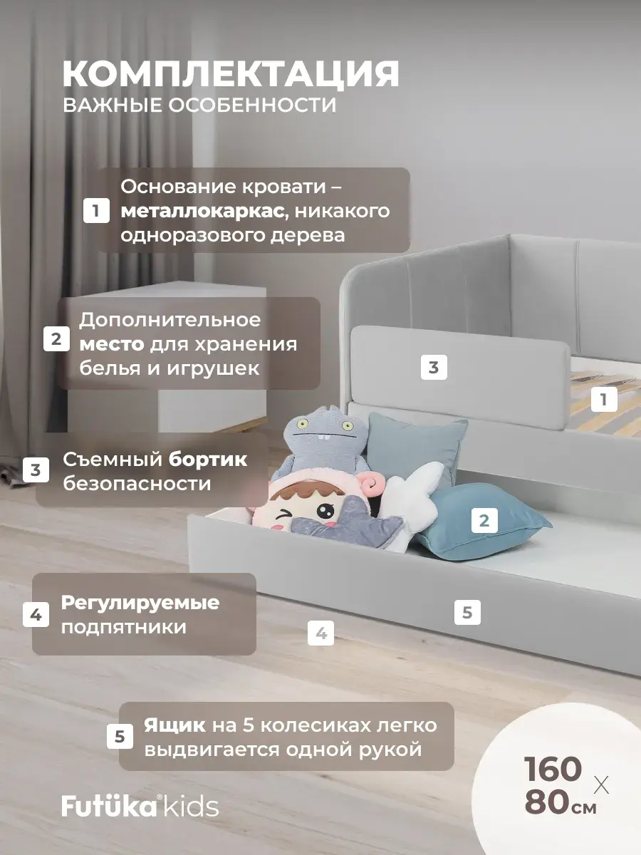 Опционально доступны ящик для белья, бортик безопасности, чехол на матрас в тон кровати и матрас, если они не входят в комплектацию. Рекомендуемая высота матраса до 15 см.