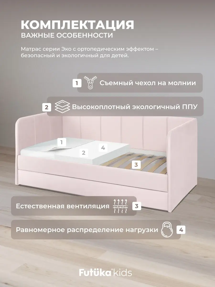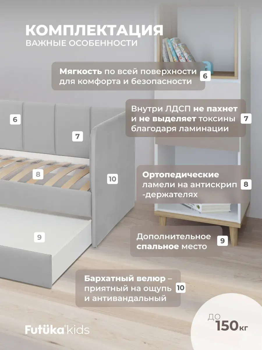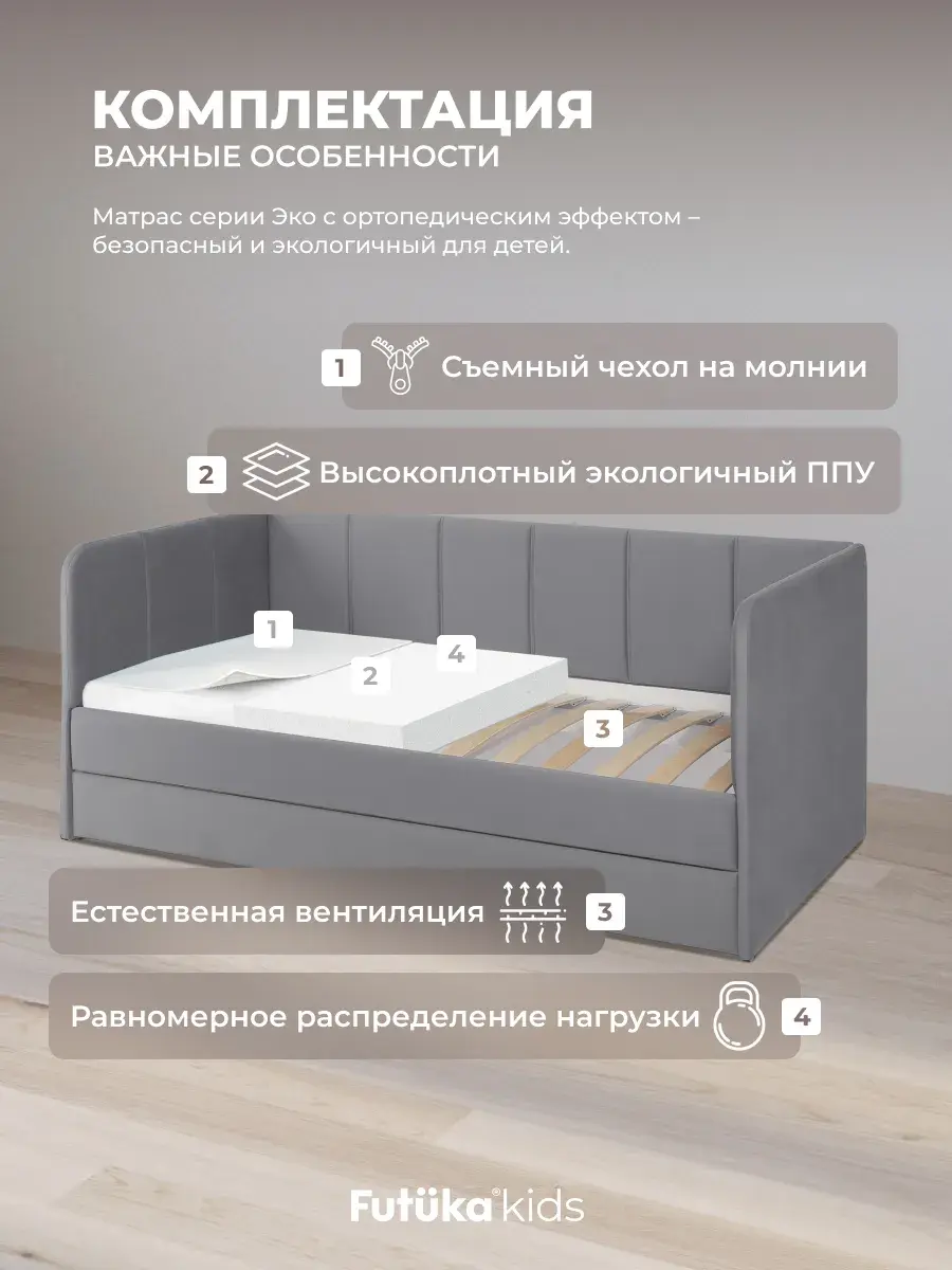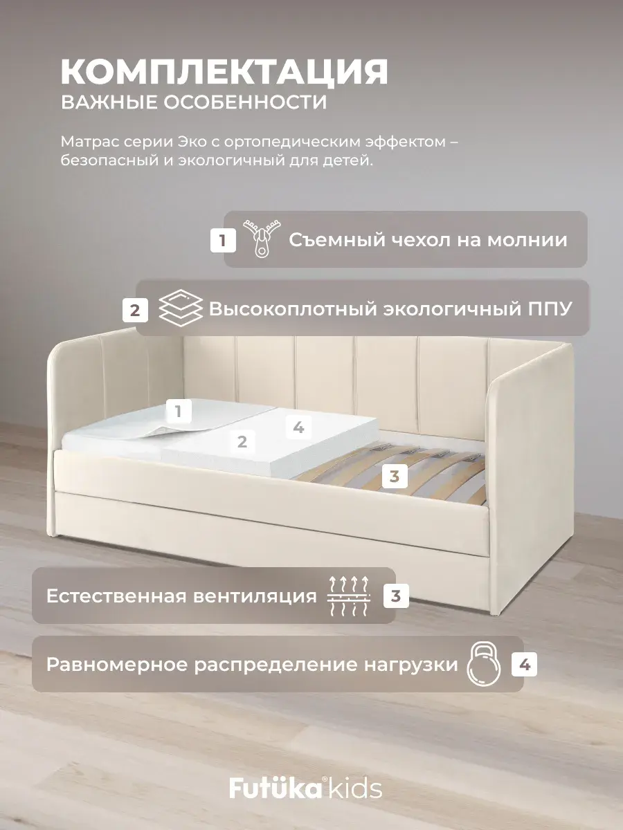 Опционально доступны ящик для белья, бортик безопасности, чехол на матрас в тон кровати и матрас, если они не входят в комплектацию. Рекомендуемая высота матраса до 15 см.