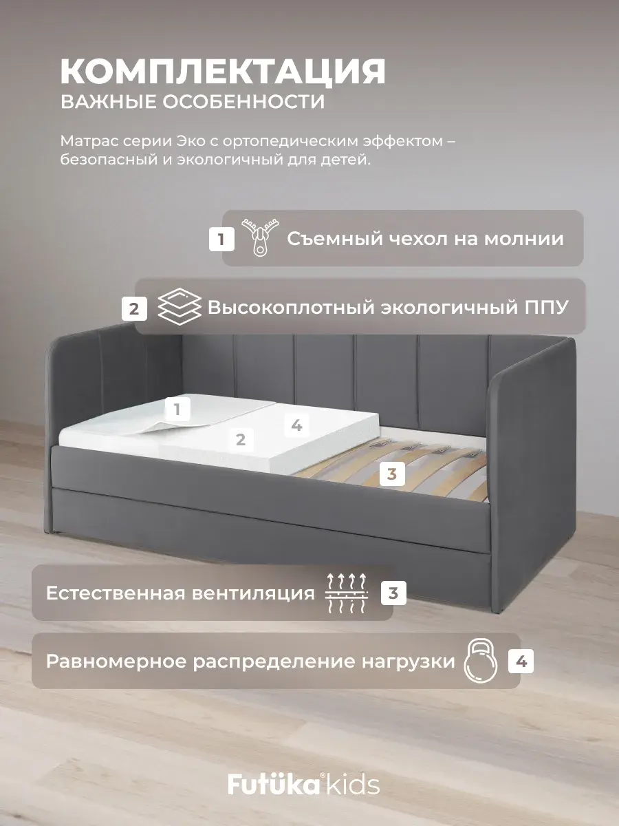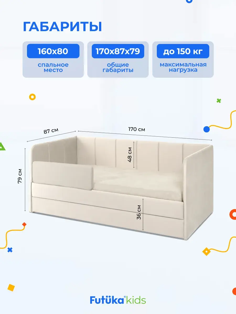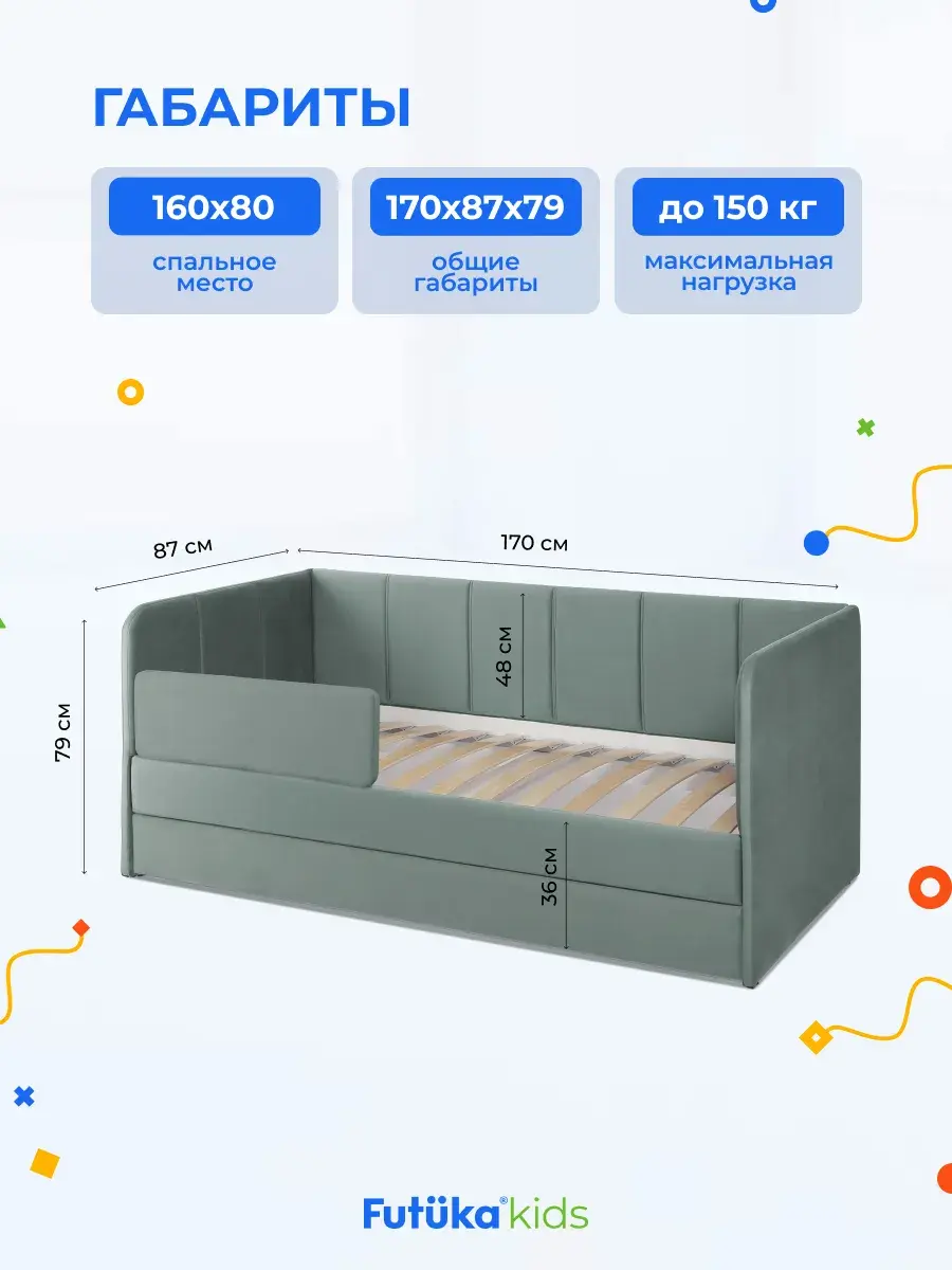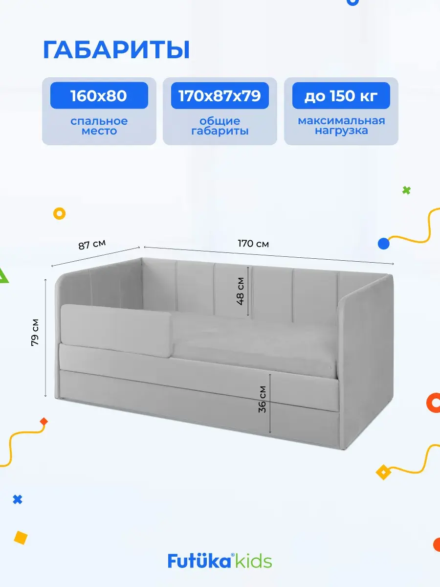 Опционально доступны ящик для белья, бортик безопасности, чехол на матрас в тон кровати и матрас, если они не входят в комплектацию. Рекомендуемая высота матраса до 15 см.