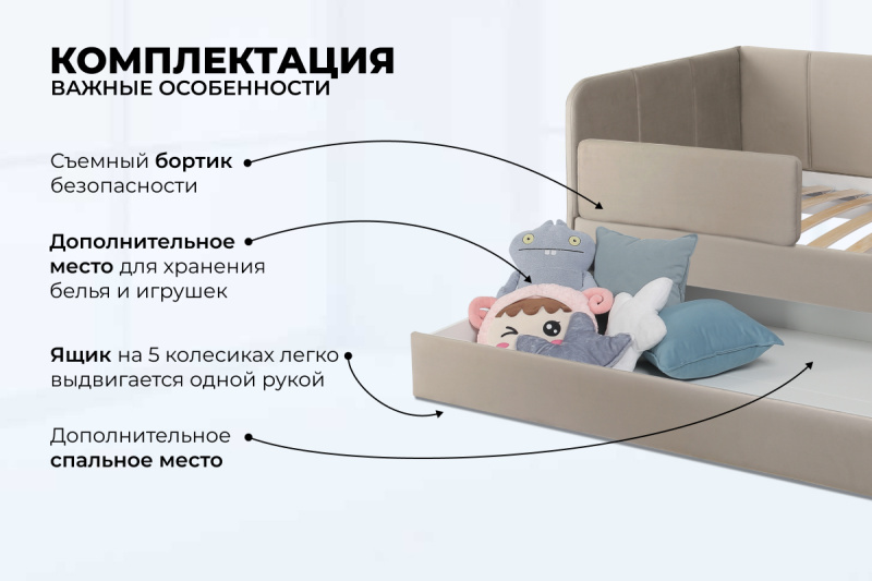 Еще одно бесспорное преимущество: возможность приобретения ящика для белья и игрушек. Ящик для белья можно с легкостью превратить в дополнительное спальное место. Для этого нужно только доукомплектовать ящик матрасом нужного размера. Каркас и дно ящика изготовлены из ЛДСП класса эмиссии Е-0,5. Это обеспечивает прочность конструкции.