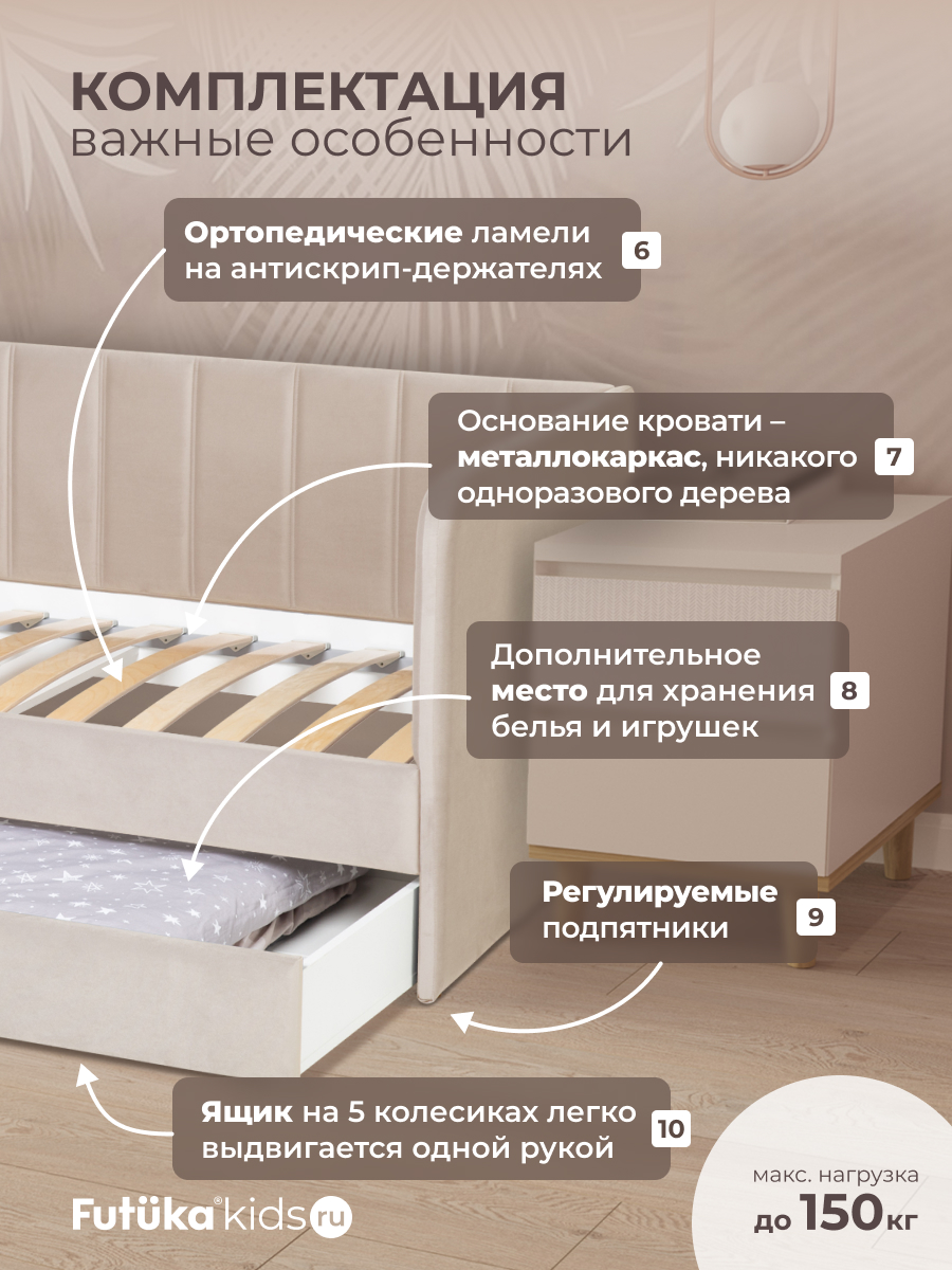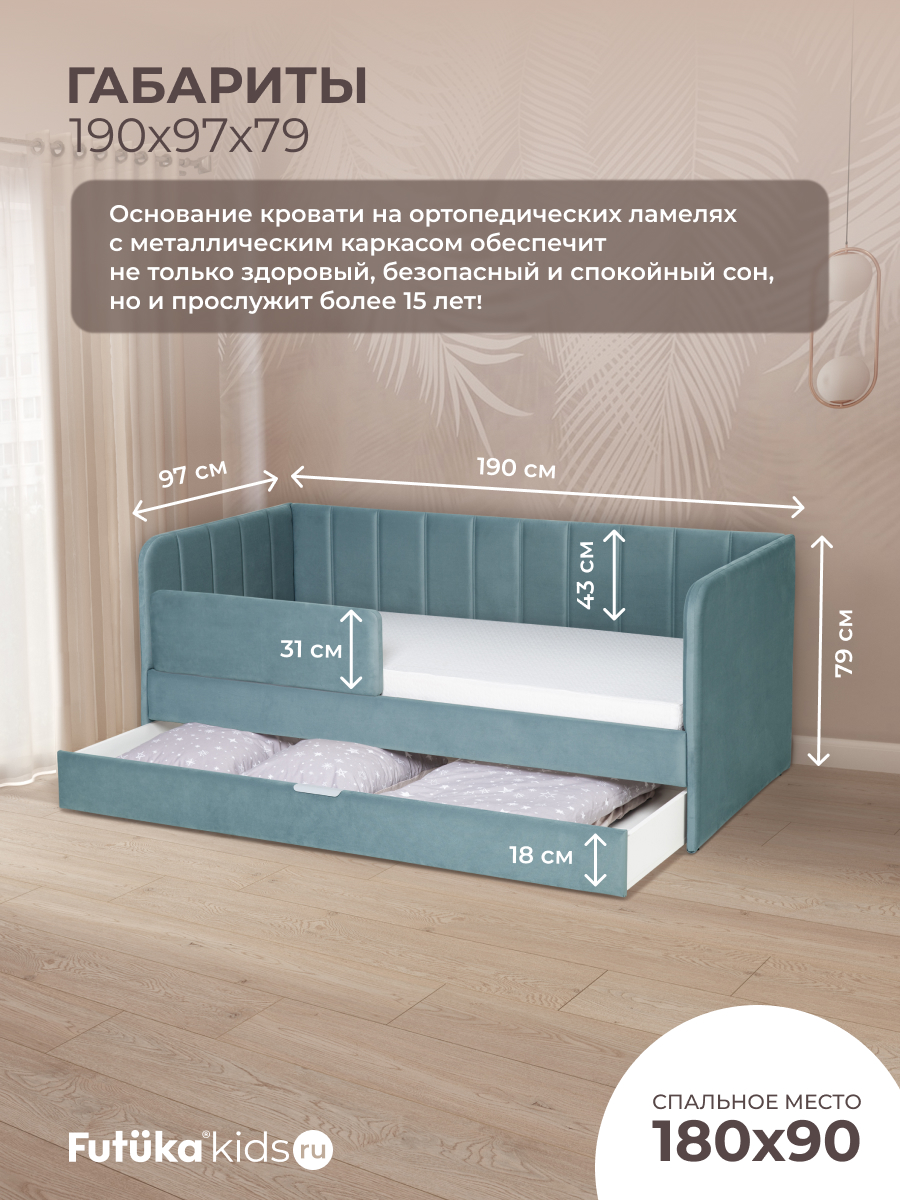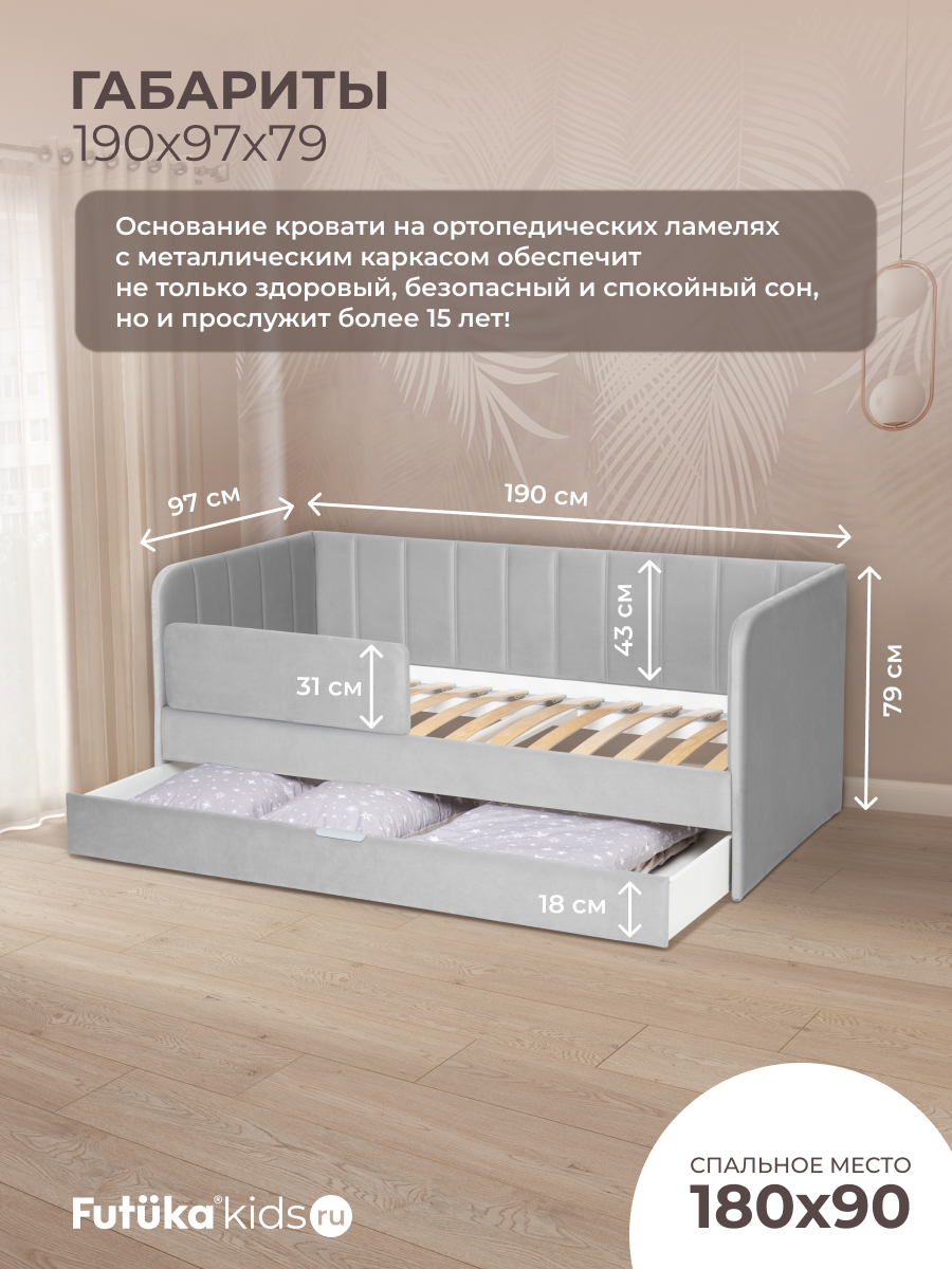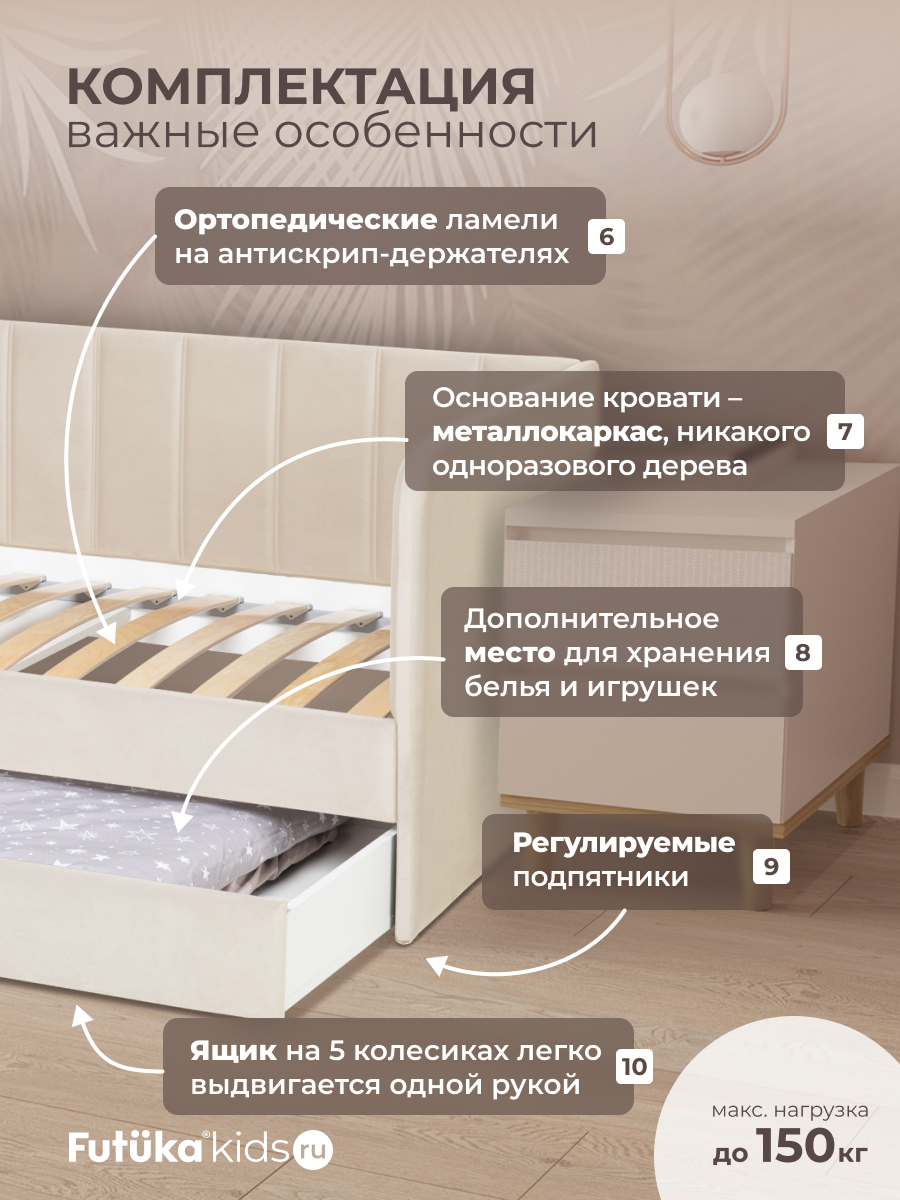 Кровать оснащена ортопедическим основанием из ламелей, которые крепятся на пластиковые держатели "антискрип" без использования саморезов. Это обеспечивает более надежную фиксацию и предотвращает скрип при использовании дивана-кровати и отличную вентиляцию матраса, позволяя ему дышать и сохранять свежесть на протяжении всего срока службы. Диван-кровать имеет металлический каркас. Преимущество такого каркаса заключается в его прочности и долговечности. Он обеспечивает стабильность и устойчивость мебели, даже при ежедневном использовании и высоких нагрузках. Это гарантирует сохранение формы и размеров на протяжении многих лет, что позволяет сэкономить на дополнительных вложениях в мебель. Еще одно бесспорное преимущество: возможность приобретения ящика для белья и игрушек. Ящик для белья можно с легкостью превратить в дополнительное спальное место. Для этого нужно только доукомплектовать ящик матрасом нужного размера. Каркас и дно ящика изготовлены из ЛДСП класса эмиссии Е-0,5. Это обеспечивает прочность конструкции.