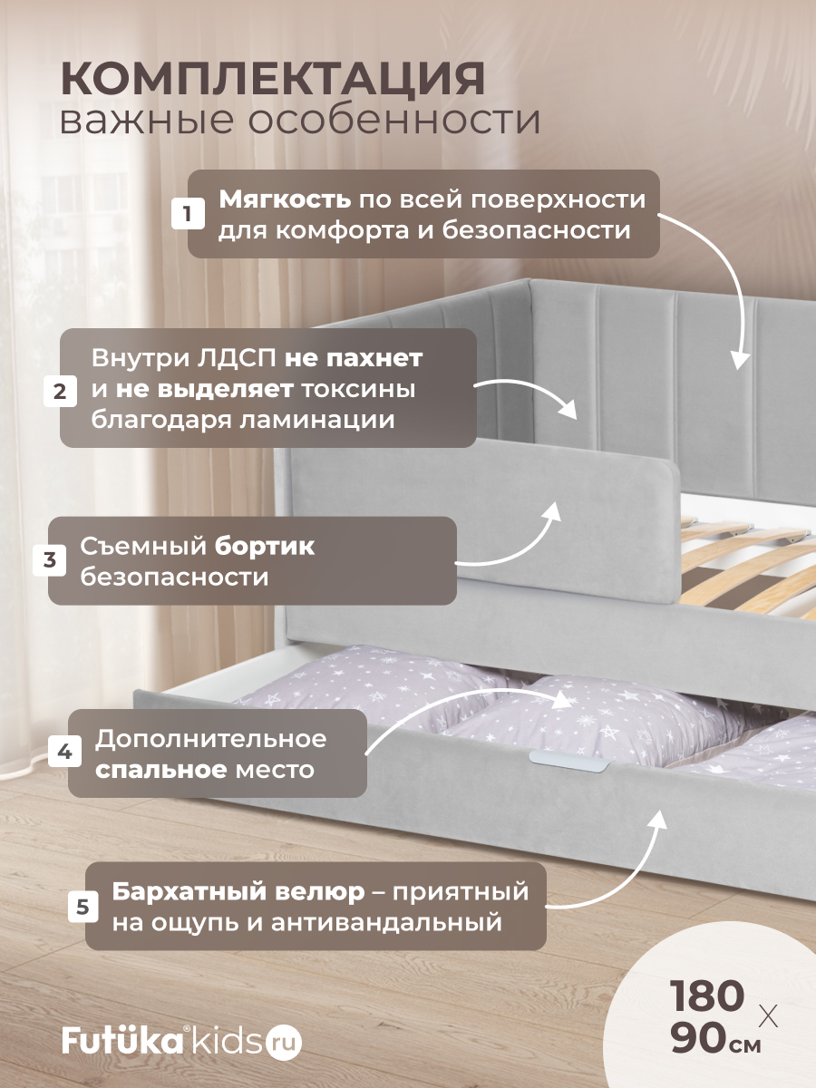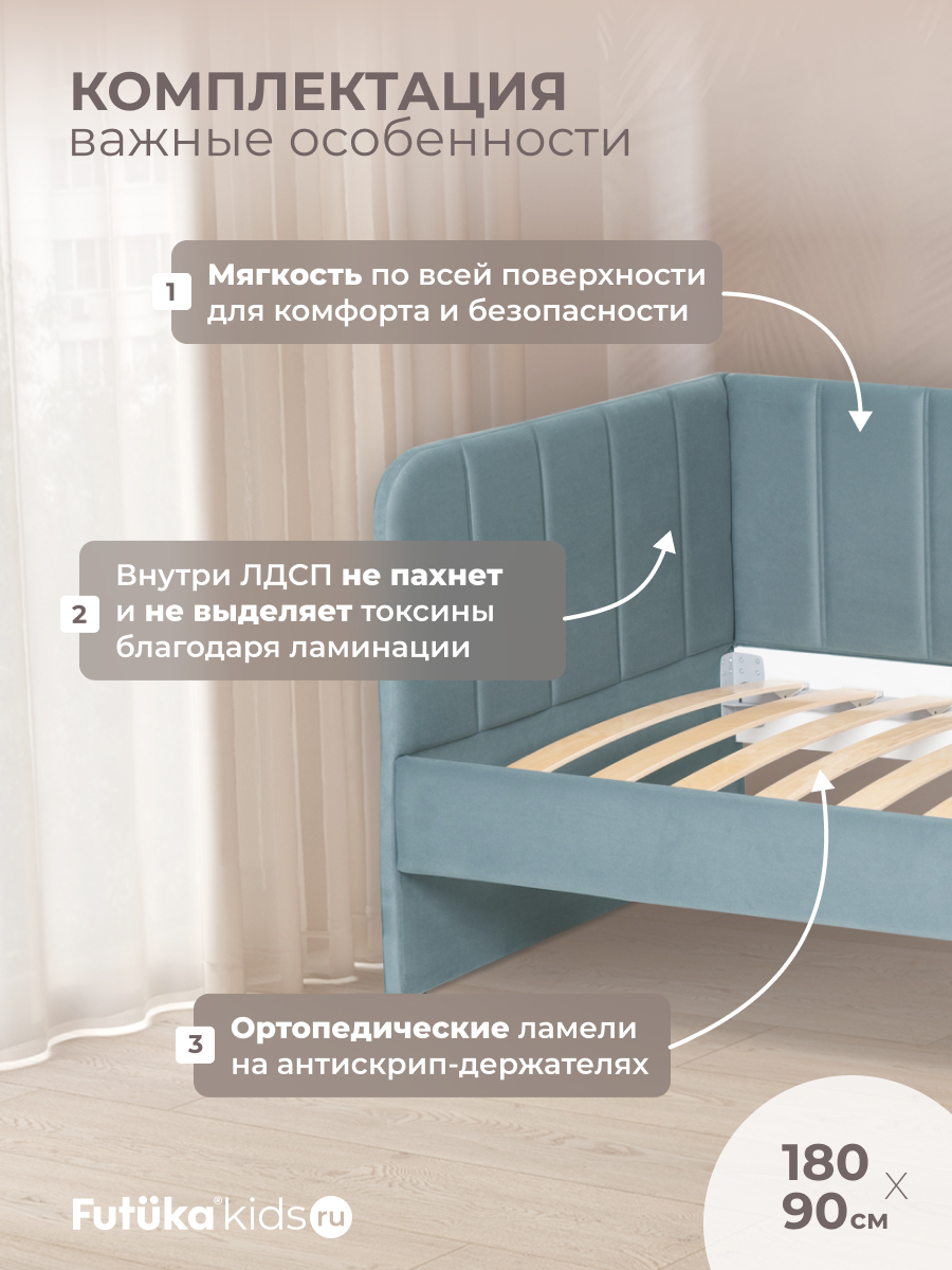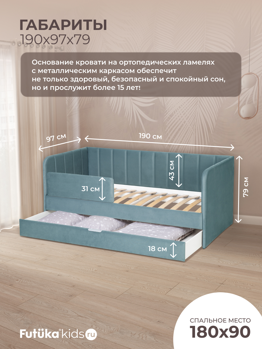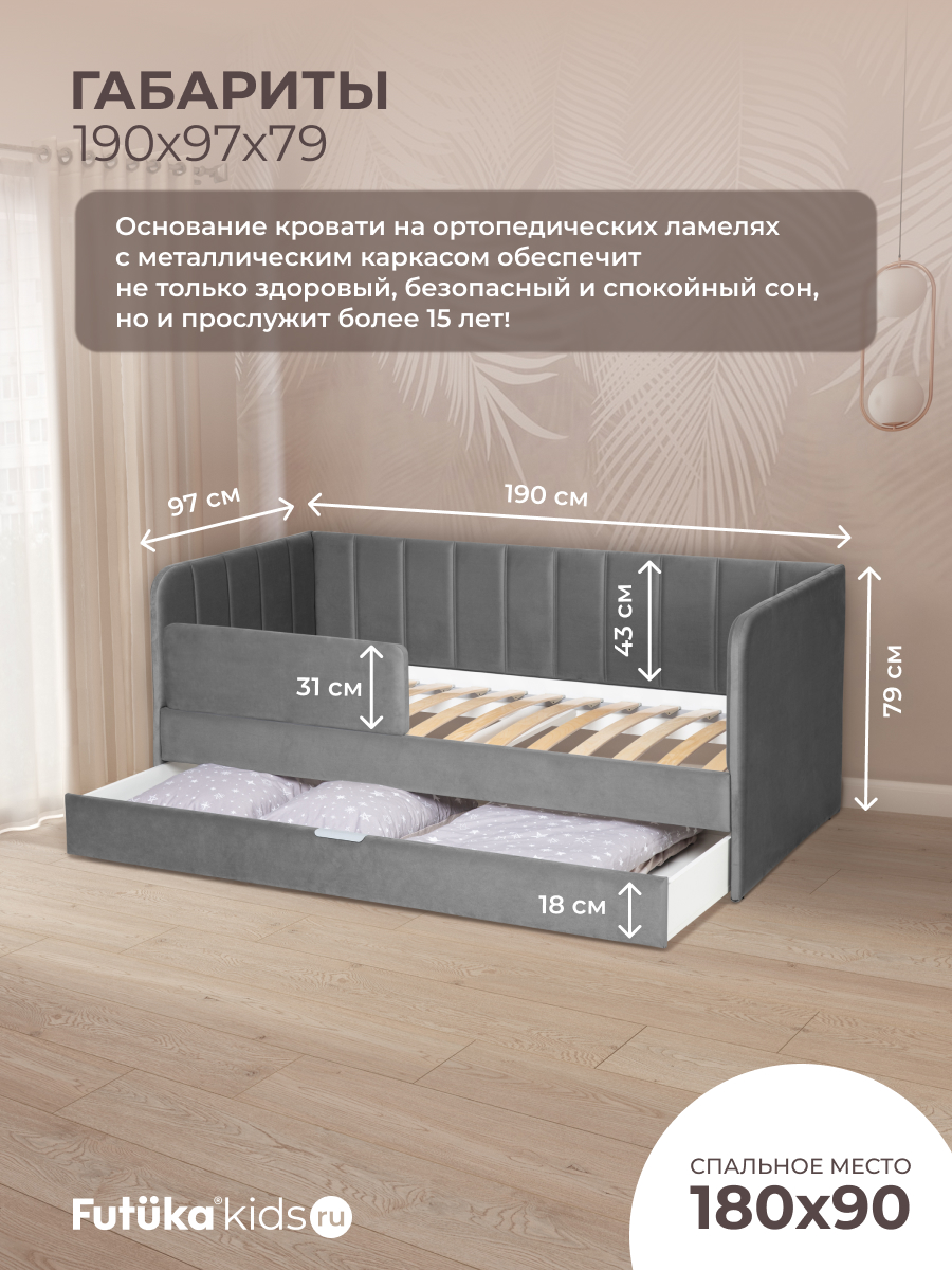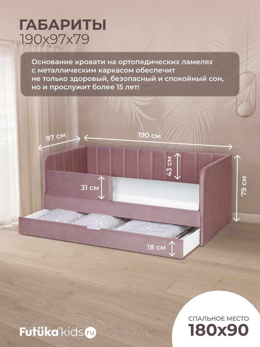 Кровать оснащена ортопедическим основанием из ламелей, которые крепятся на пластиковые держатели "антискрип" без использования саморезов. Это обеспечивает более надежную фиксацию и предотвращает скрип при использовании дивана-кровати и отличную вентиляцию матраса, позволяя ему дышать и сохранять свежесть на протяжении всего срока службы. Диван-кровать имеет металлический каркас. Преимущество такого каркаса заключается в его прочности и долговечности. Он обеспечивает стабильность и устойчивость мебели, даже при ежедневном использовании и высоких нагрузках. Это гарантирует сохранение формы и размеров на протяжении многих лет, что позволяет сэкономить на дополнительных вложениях в мебель. Еще одно бесспорное преимущество: возможность приобретения ящика для белья и игрушек. Ящик для белья можно с легкостью превратить в дополнительное спальное место. Для этого нужно только доукомплектовать ящик матрасом нужного размера. Каркас и дно ящика изготовлены из ЛДСП класса эмиссии Е-0,5. Это обеспечивает прочность конструкции.
