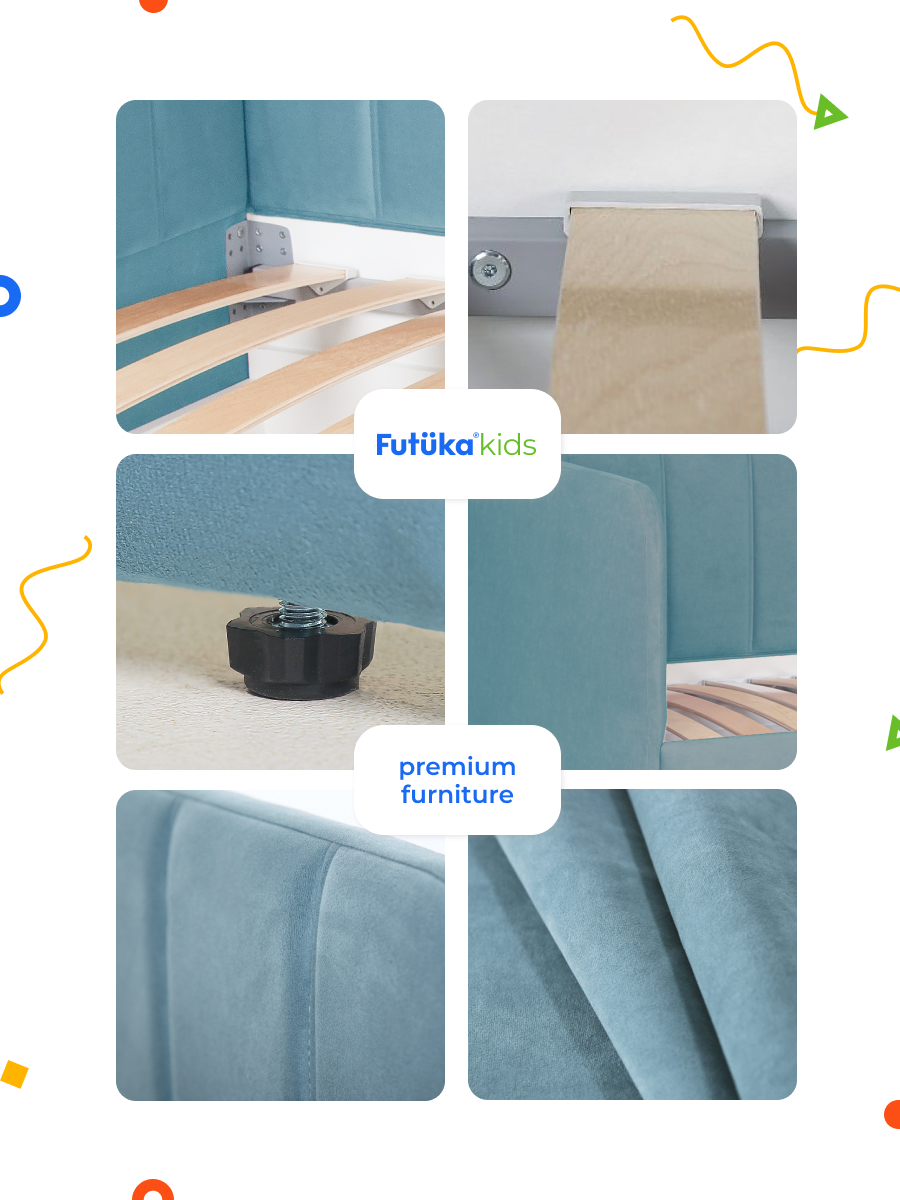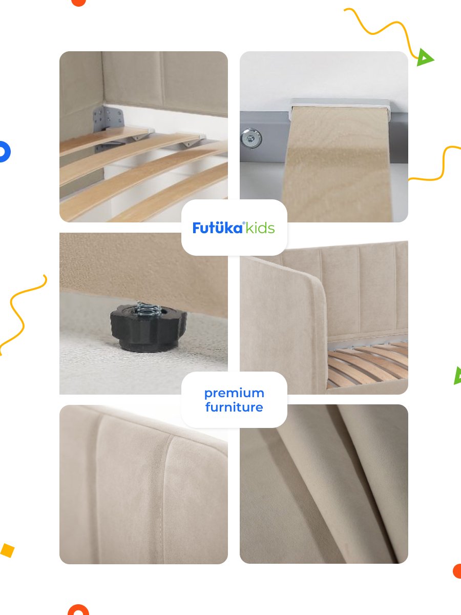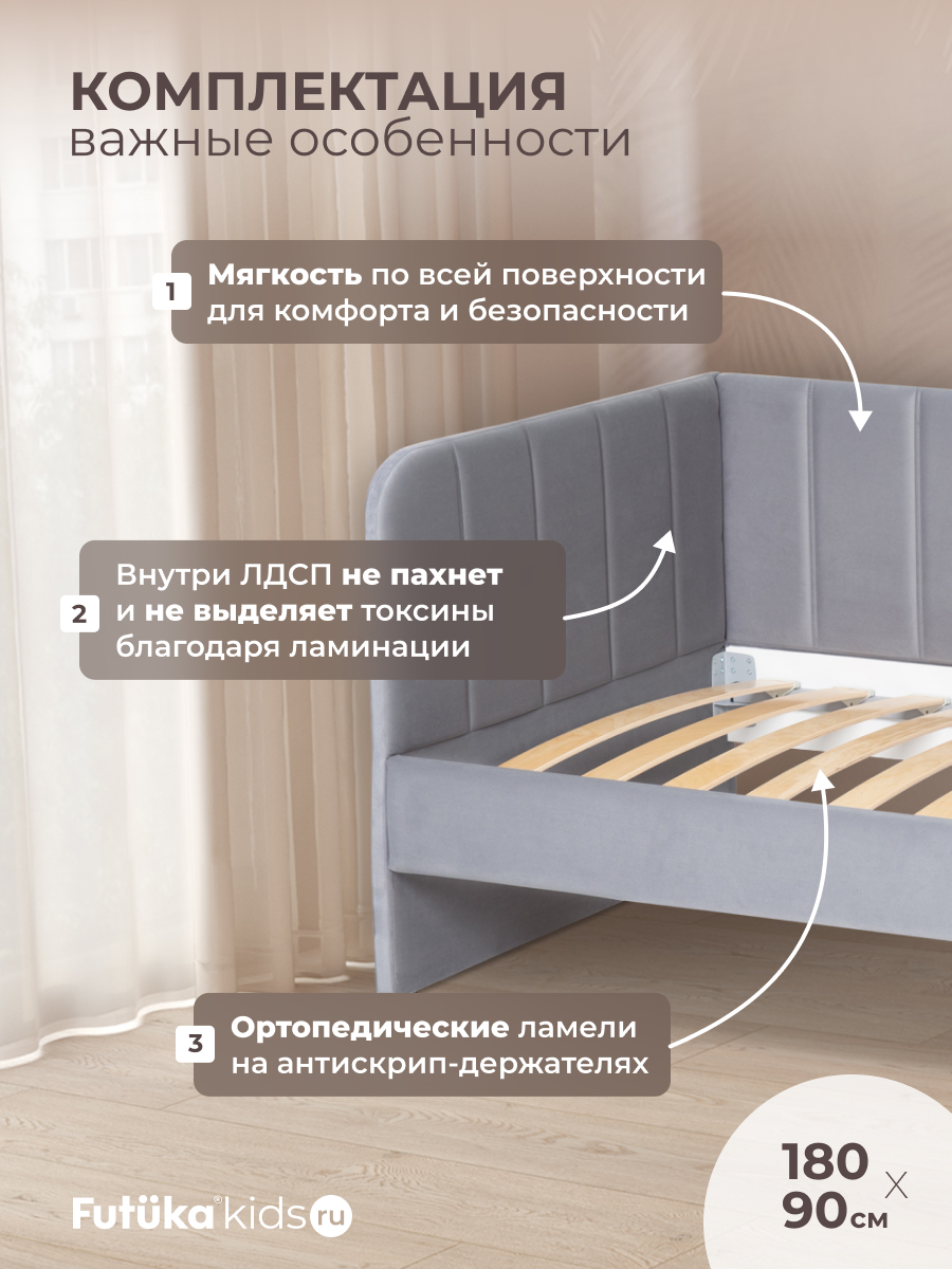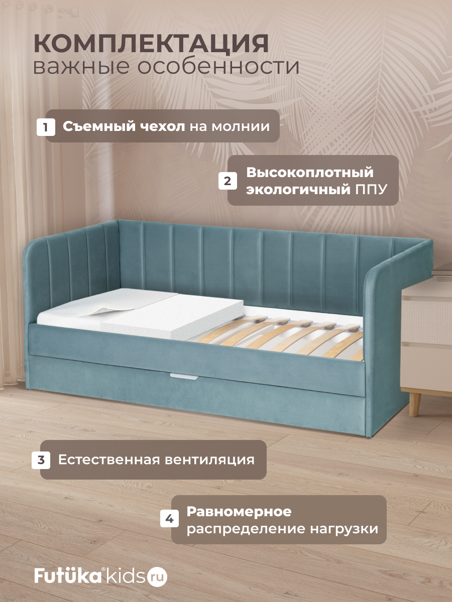 Кровать оснащена ортопедическим основанием из ламелей, которые крепятся на пластиковые держатели "антискрип" без использования саморезов. Это обеспечивает более надежную фиксацию и предотвращает скрип при использовании дивана-кровати и отличную вентиляцию матраса, позволяя ему дышать и сохранять свежесть на протяжении всего срока службы. Диван-кровать имеет металлический каркас. Преимущество такого каркаса заключается в его прочности и долговечности. Он обеспечивает стабильность и устойчивость мебели, даже при ежедневном использовании и высоких нагрузках. Это гарантирует сохранение формы и размеров на протяжении многих лет, что позволяет сэкономить на дополнительных вложениях в мебель. Еще одно бесспорное преимущество: возможность приобретения ящика для белья и игрушек. Ящик для белья можно с легкостью превратить в дополнительное спальное место. Для этого нужно только доукомплектовать ящик матрасом нужного размера. Каркас и дно ящика изготовлены из ЛДСП класса эмиссии Е-0,5. Это обеспечивает прочность конструкции.