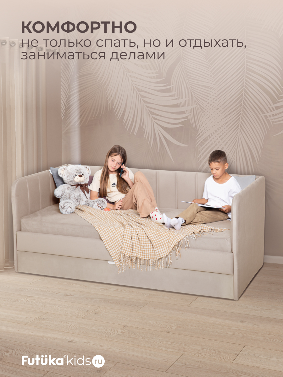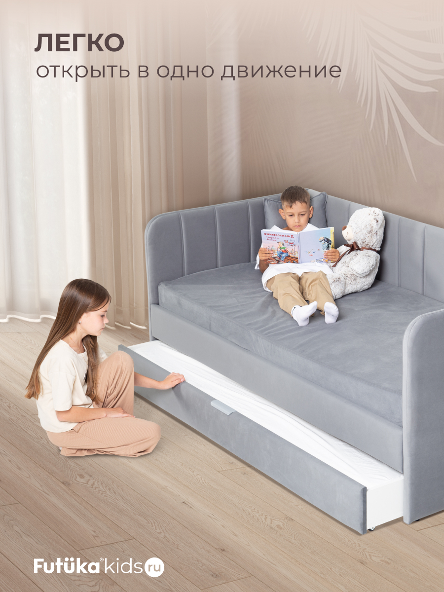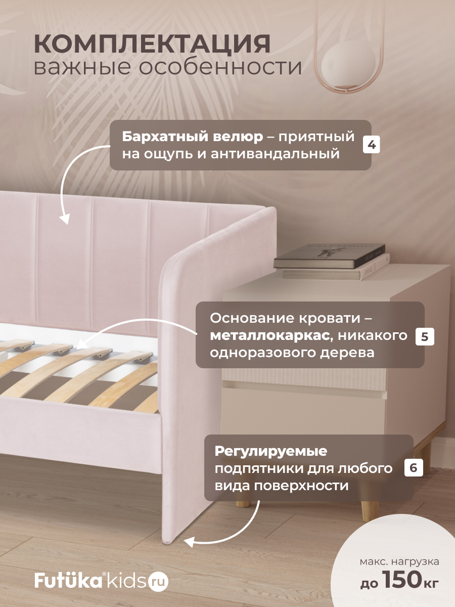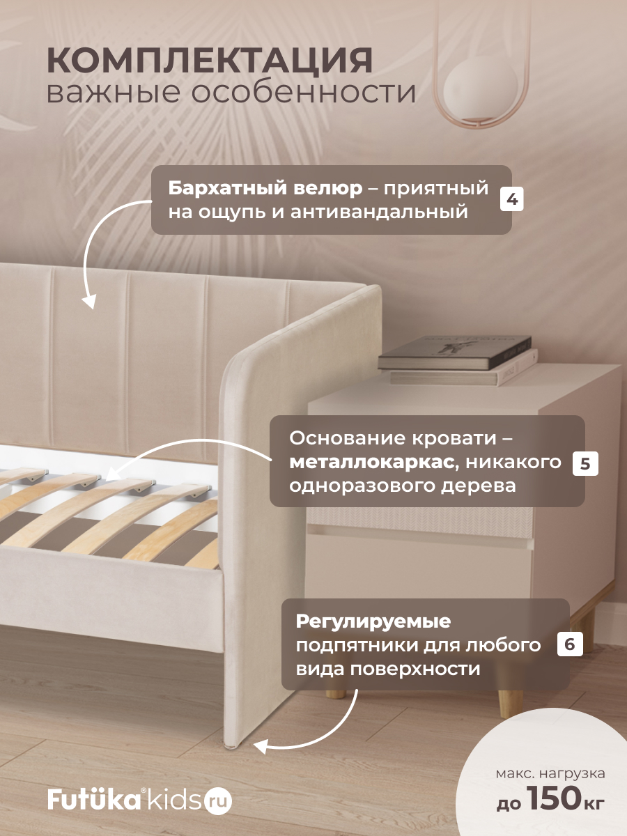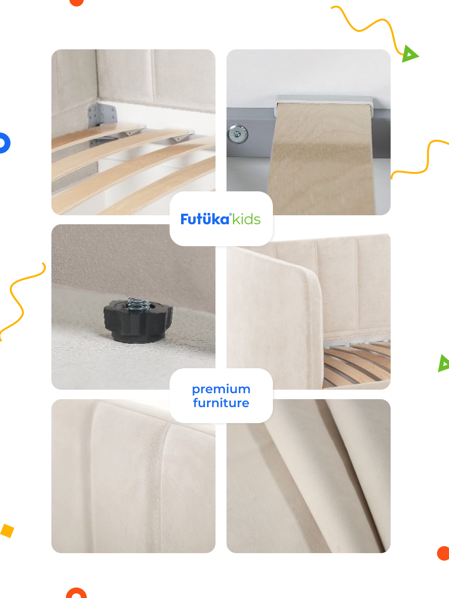 Кровать оснащена ортопедическим основанием из ламелей, которые крепятся на пластиковые держатели "антискрип" без использования саморезов. Это обеспечивает более надежную фиксацию и предотвращает скрип при использовании дивана-кровати и отличную вентиляцию матраса, позволяя ему дышать и сохранять свежесть на протяжении всего срока службы. Диван-кровать имеет металлический каркас. Преимущество такого каркаса заключается в его прочности и долговечности. Он обеспечивает стабильность и устойчивость мебели, даже при ежедневном использовании и высоких нагрузках. Это гарантирует сохранение формы и размеров на протяжении многих лет, что позволяет сэкономить на дополнительных вложениях в мебель. Еще одно бесспорное преимущество: возможность приобретения ящика для белья и игрушек. Ящик для белья можно с легкостью превратить в дополнительное спальное место. Для этого нужно только доукомплектовать ящик матрасом нужного размера. Каркас и дно ящика изготовлены из ЛДСП класса эмиссии Е-0,5. Это обеспечивает прочность конструкции.