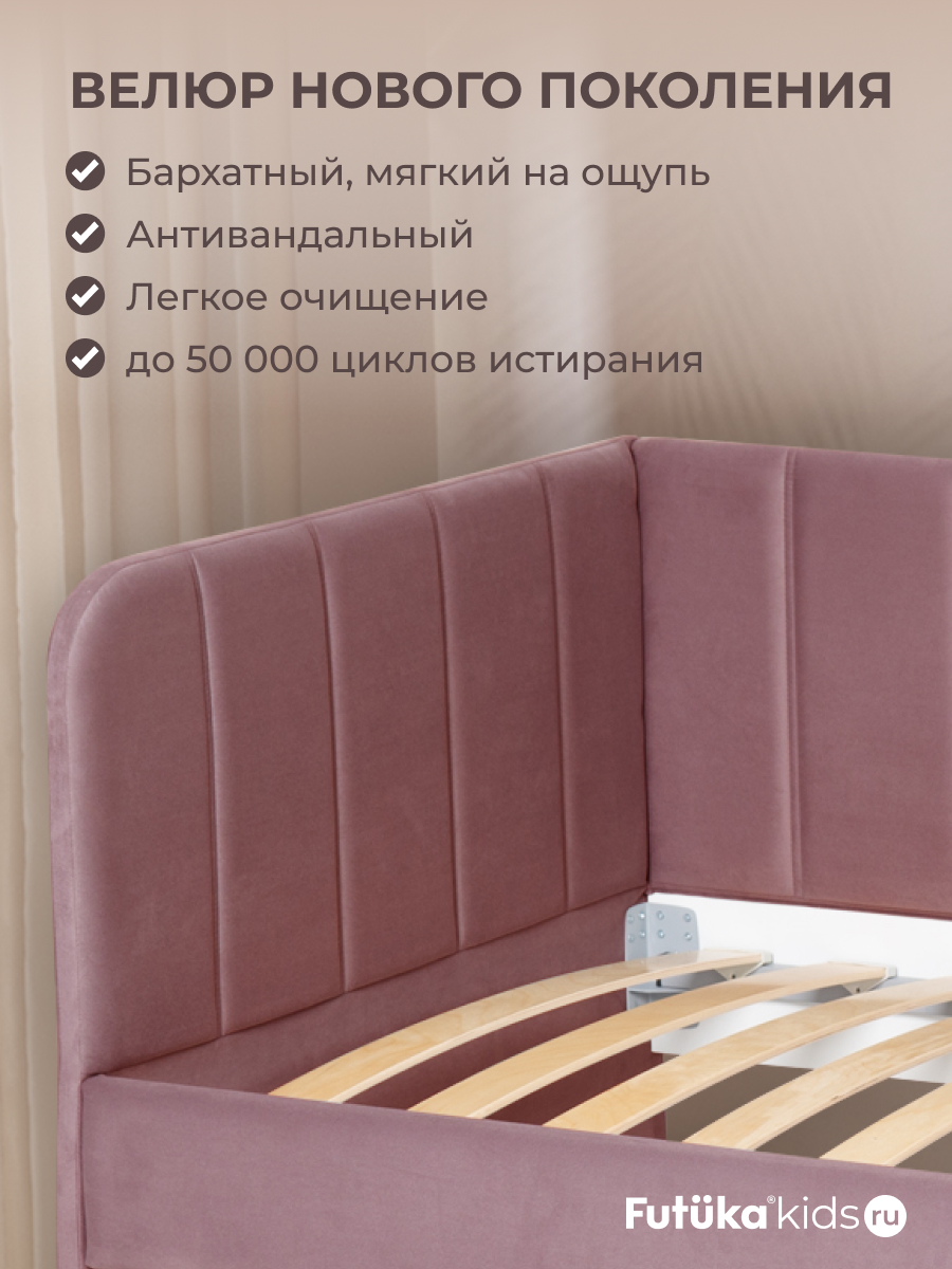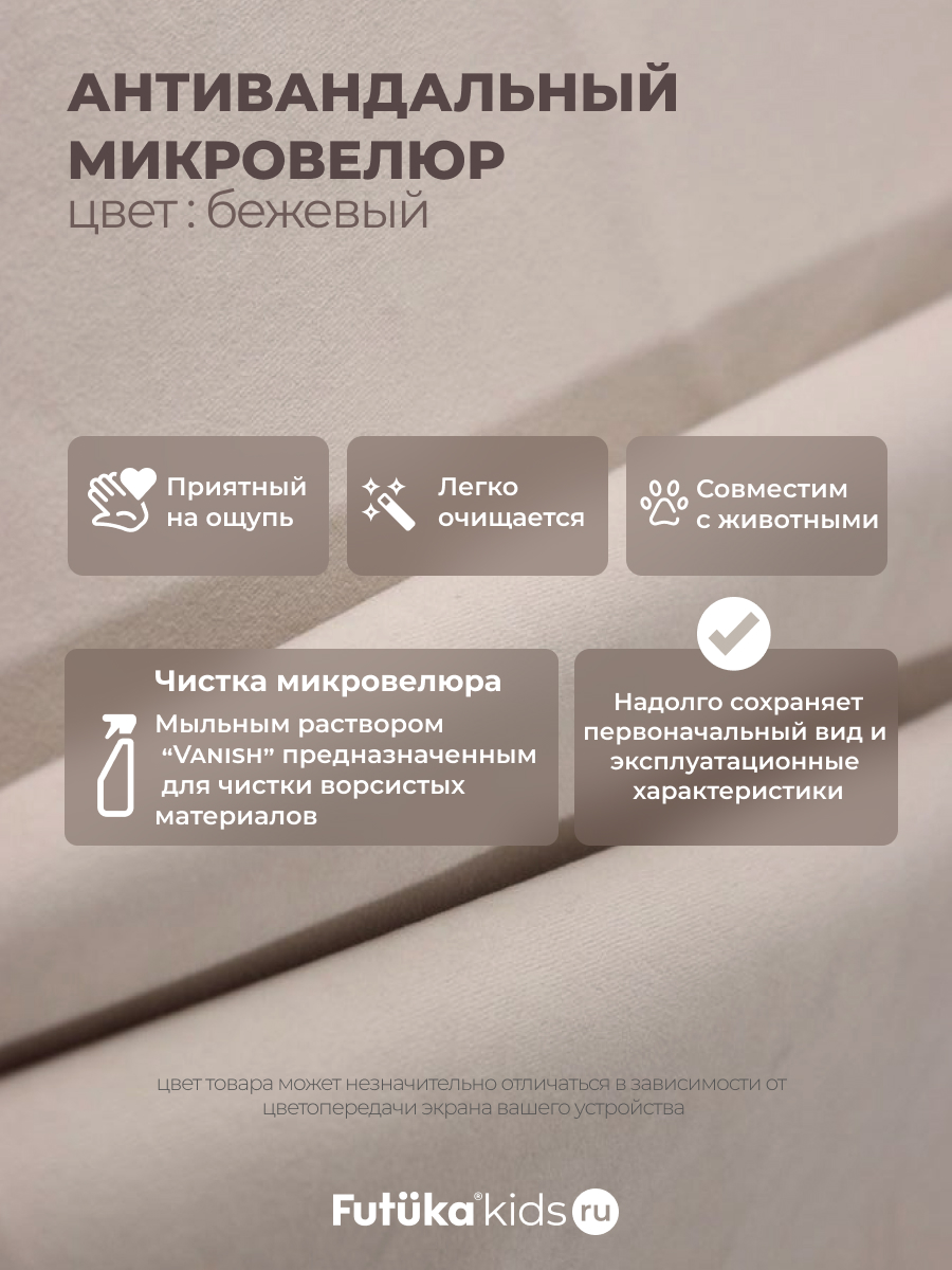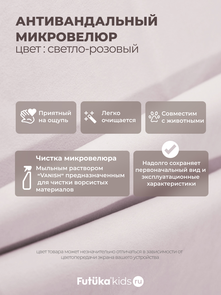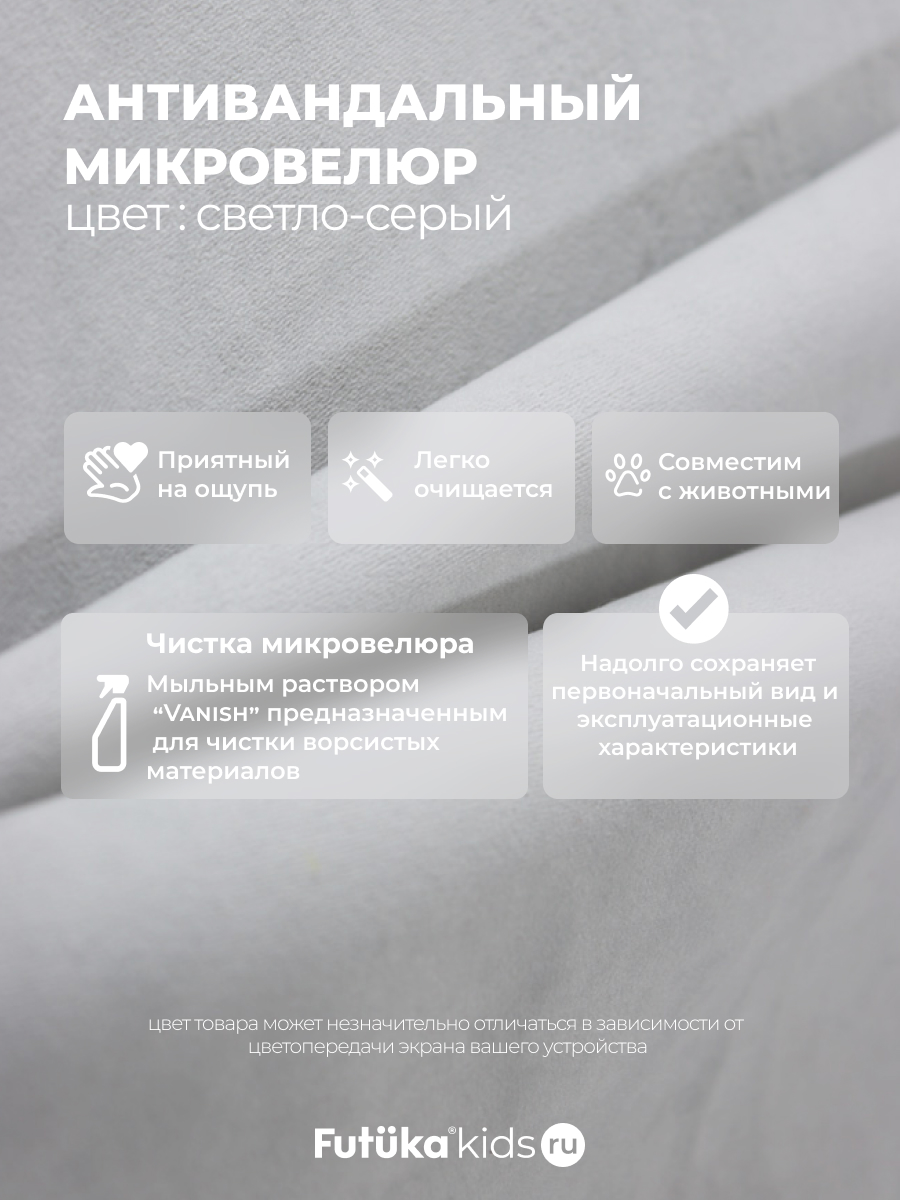 Мягкая обивка создает атмосферу уюта. При создании новинки мы использовали ткань велюр последнего поколения, отличающуюся такими свойствами как: ультра мягкость; повышенная износостойкость, за счет инновационных методов производства; легкая чистка.