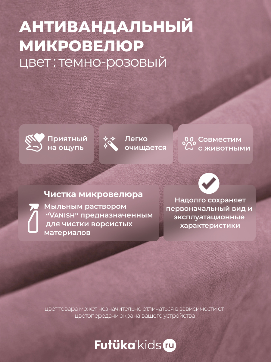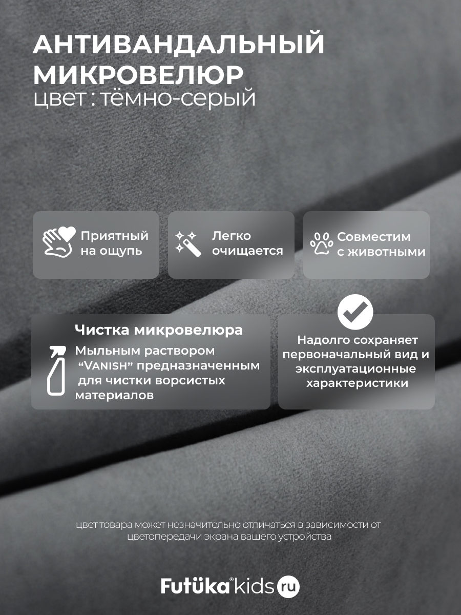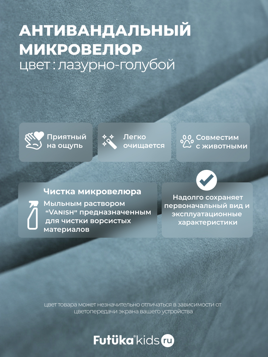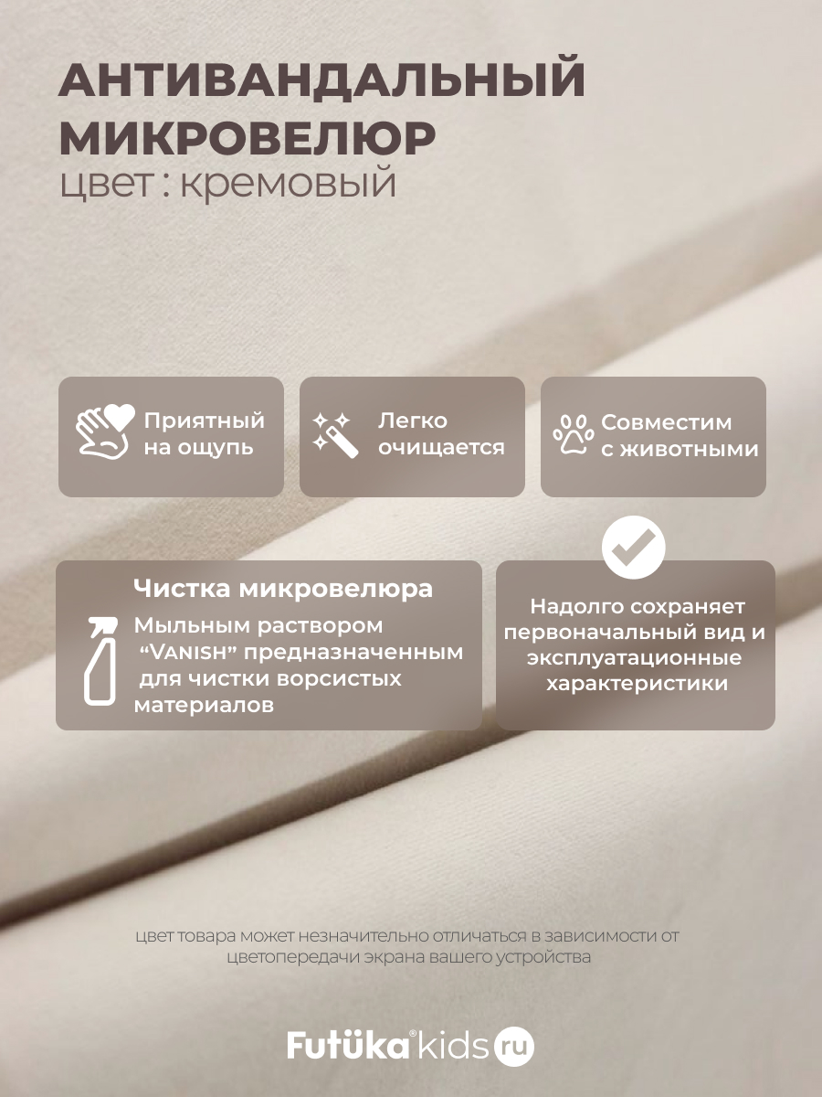 Мягкая обивка создает атмосферу уюта. При создании новинки мы использовали ткань велюр последнего поколения, отличающуюся такими свойствами как: ультра мягкость; повышенная износостойкость, за счет инновационных методов производства; легкая чистка.