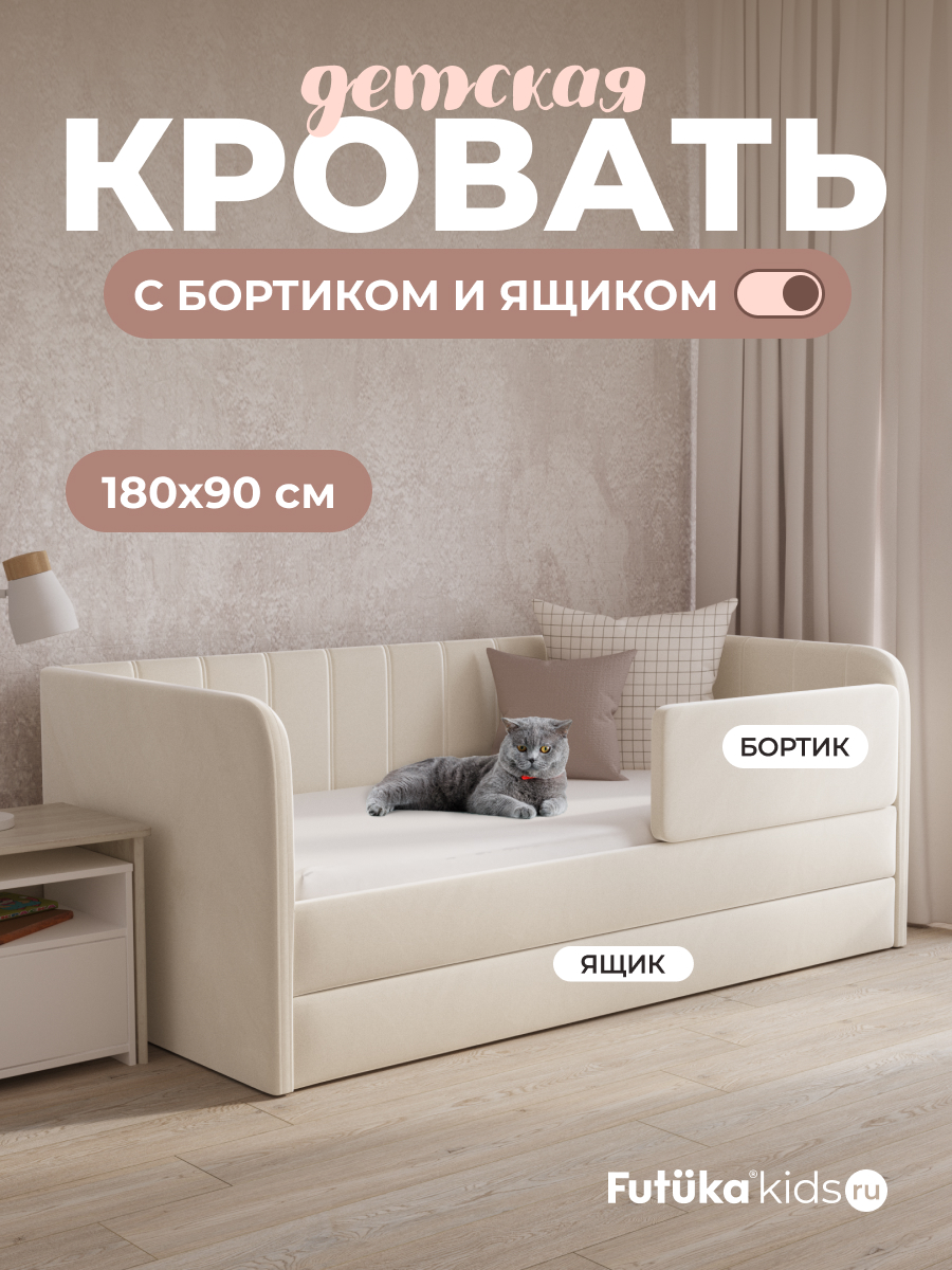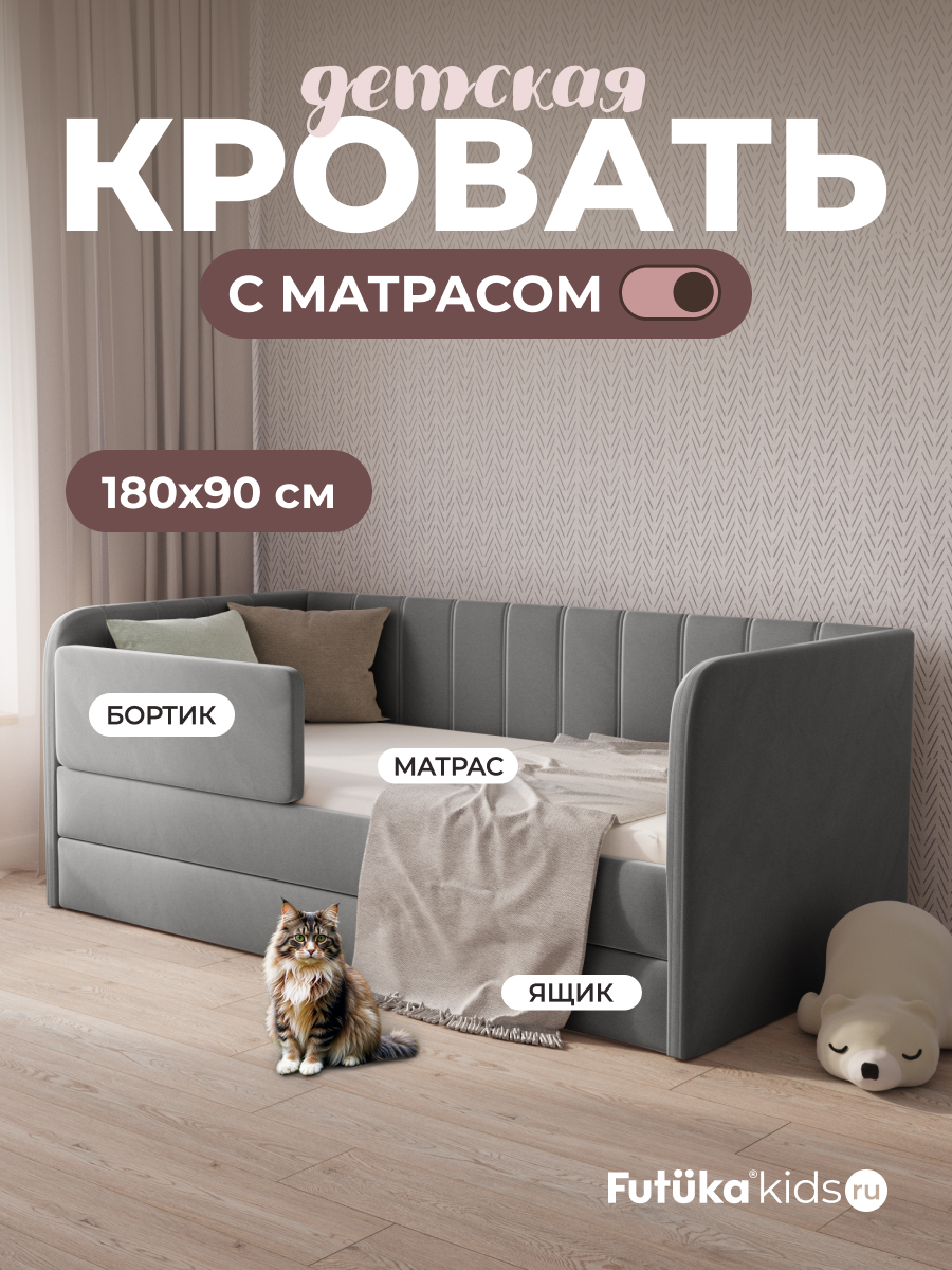 Опционально доступны ящик для белья, бортик безопасности, чехол на матрас в тон кровати и матрас. Рекомендуемая высота матраса до 15 см.