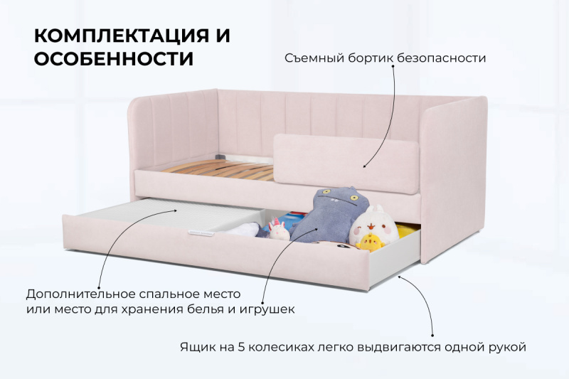 Опционально доступны ящик для белья, бортик безопасности, чехол на матрас в тон кровати и матрас. Рекомендуемая высота матраса до 15 см.