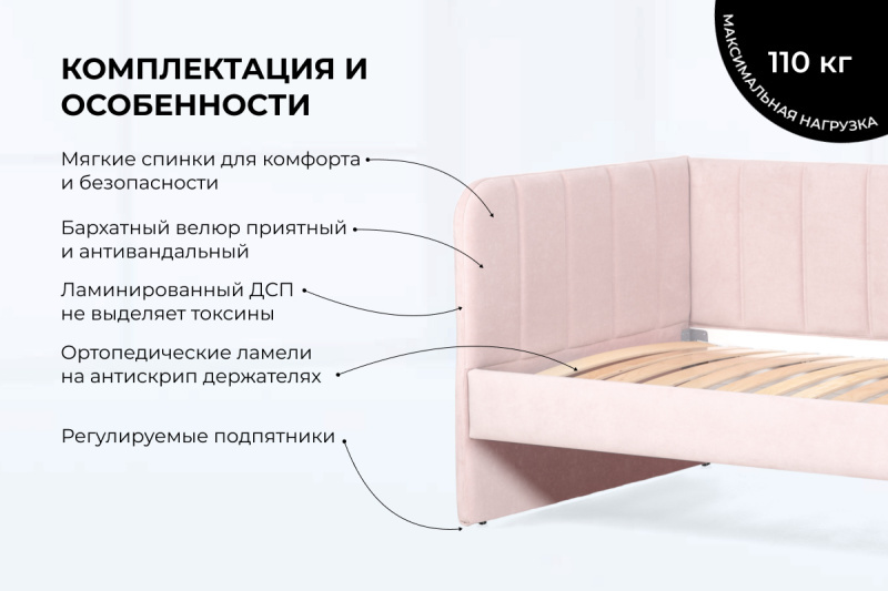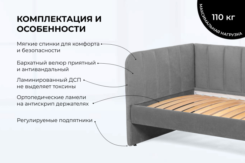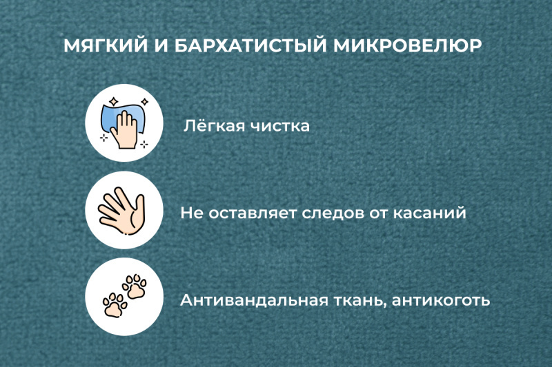 Мягкая обивка создает атмосферу уюта. При создании новинки мы использовали ткань велюр последнего поколения, отличающуюся такими свойствами как: ультра мягкость; повышенная износостойкость, за счет инновационных методов производства; легкая чистка.