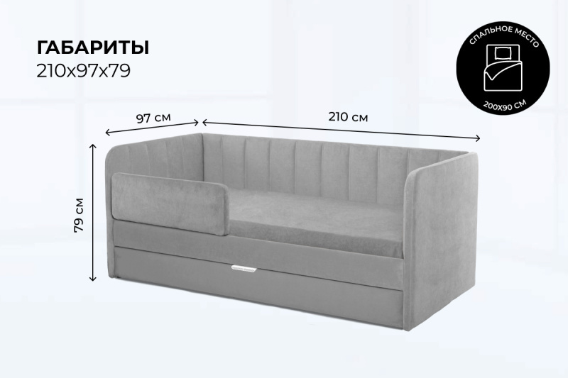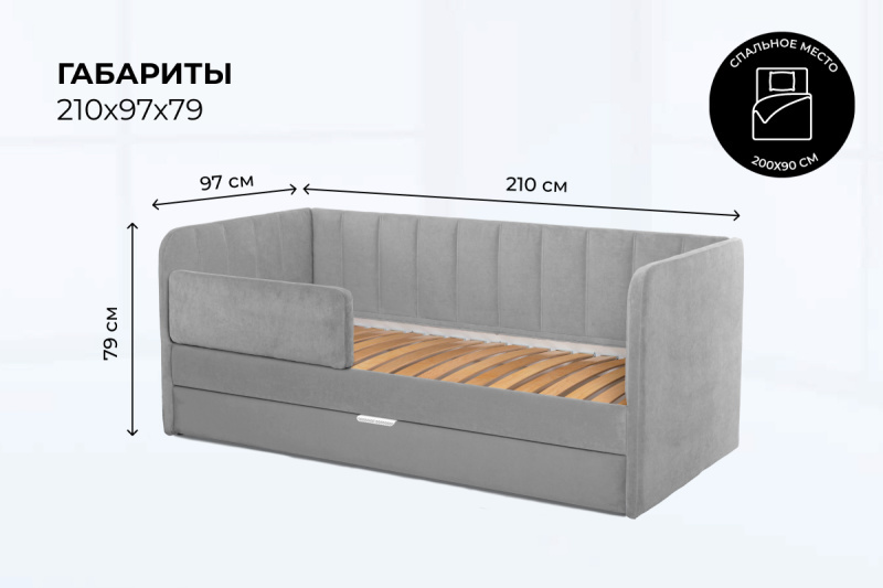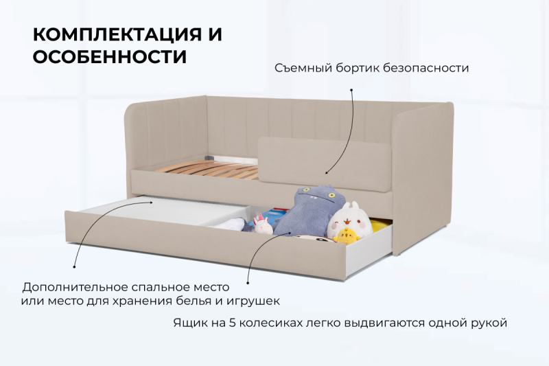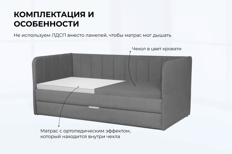 Кровать оснащена ортопедическим основанием из ламелей, которые крепятся на пластиковые держатели "антискрип" без использования саморезов. Это обеспечивает более надежную фиксацию и предотвращает скрип при использовании дивана-кровати и отличную вентиляцию матраса, позволяя ему дышать и сохранять свежесть на протяжении всего срока службы. Диван-кровать имеет металлический каркас. Преимущество такого каркаса заключается в его прочности и долговечности. Он обеспечивает стабильность и устойчивость мебели, даже при ежедневном использовании и высоких нагрузках. Это гарантирует сохранение формы и размеров на протяжении многих лет, что позволяет сэкономить на дополнительных вложениях в мебель. Еще одно бесспорное преимущество: возможность приобретения ящика для белья и игрушек. Ящик для белья можно с легкостью превратить в дополнительное спальное место. Для этого нужно только доукомплектовать ящик матрасом нужного размера. Каркас и дно ящика изготовлены из ЛДСП класса эмиссии Е-0,5. Это обеспечивает прочность конструкции.