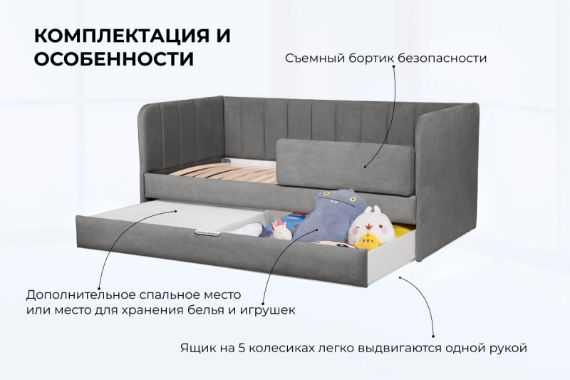 Опционально доступны ящик для белья, бортик безопасности, чехол на матрас в тон кровати и матрас.