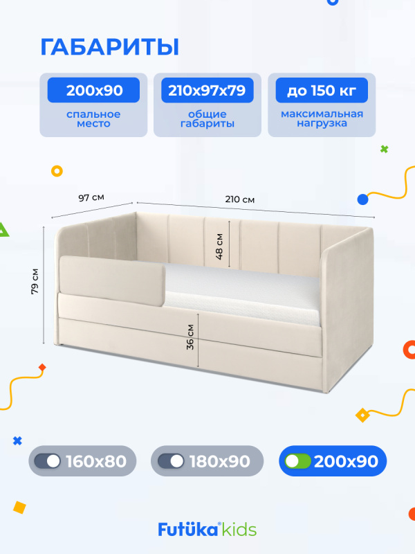 Опционально доступны ящик для белья, бортик безопасности, чехол на матрас в тон кровати и матрас, если они не входят в комплектацию. Рекомендуемая высота матраса до 15 см.