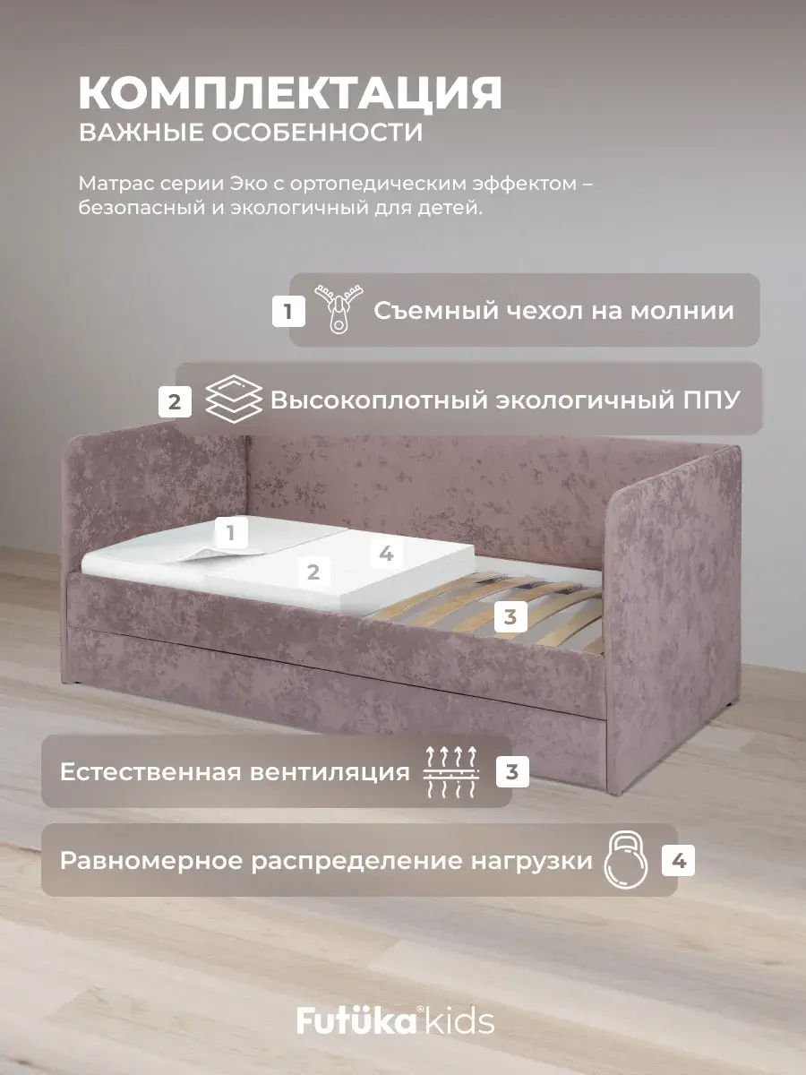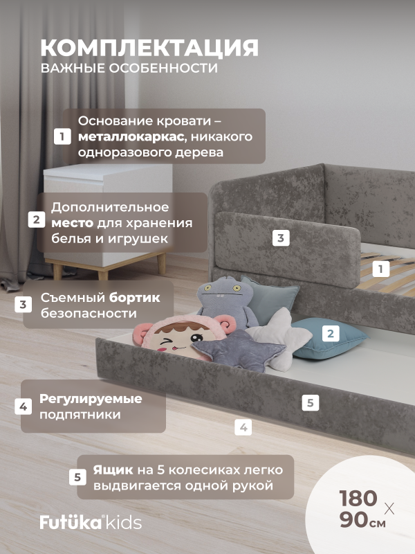 Безопасность: имеет сглаженные углы по всему периметру, а всеобщая мягкость кровати не допустит ушибов.