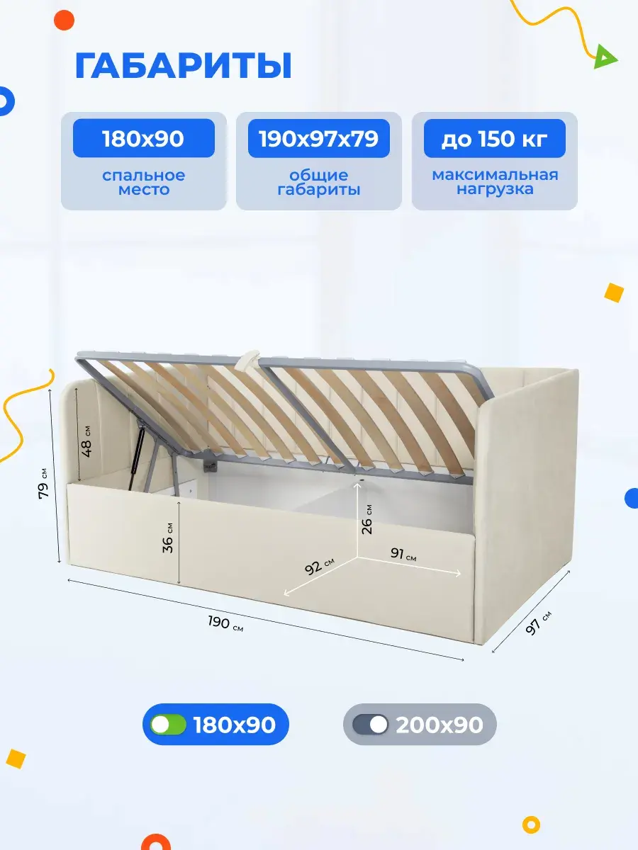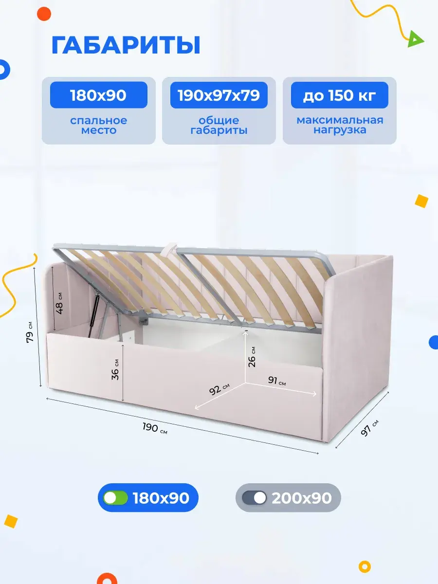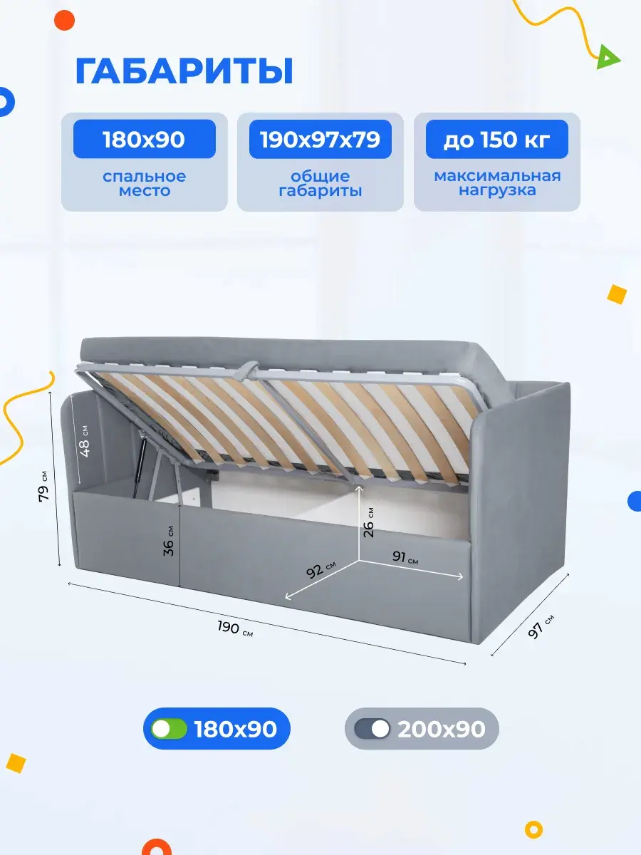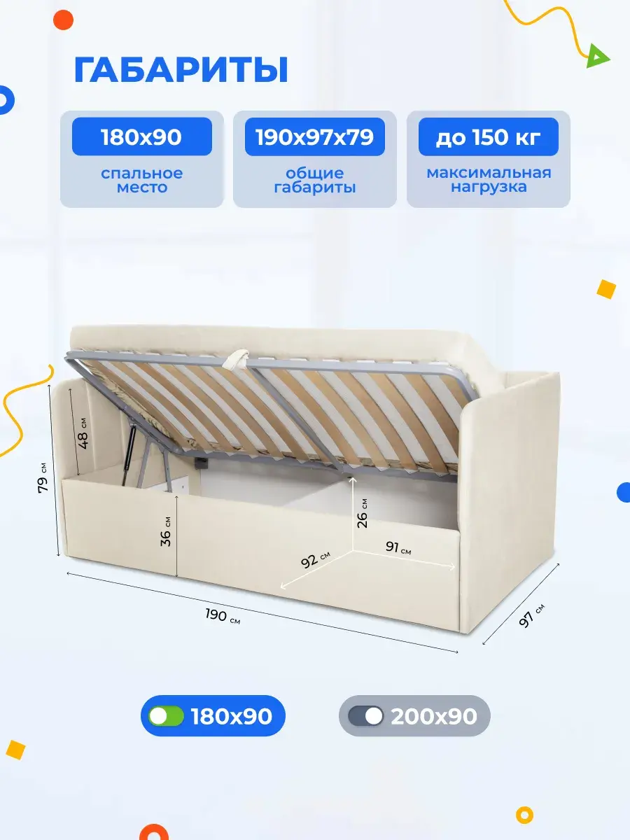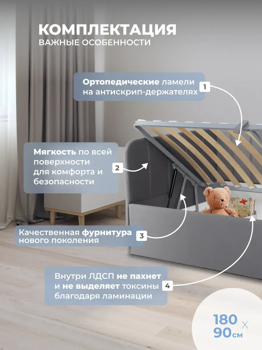 2. Универсальность: размер кровати составляет 90x180 или 90x200 см, что делает её подходящей для детей разных возрастов.