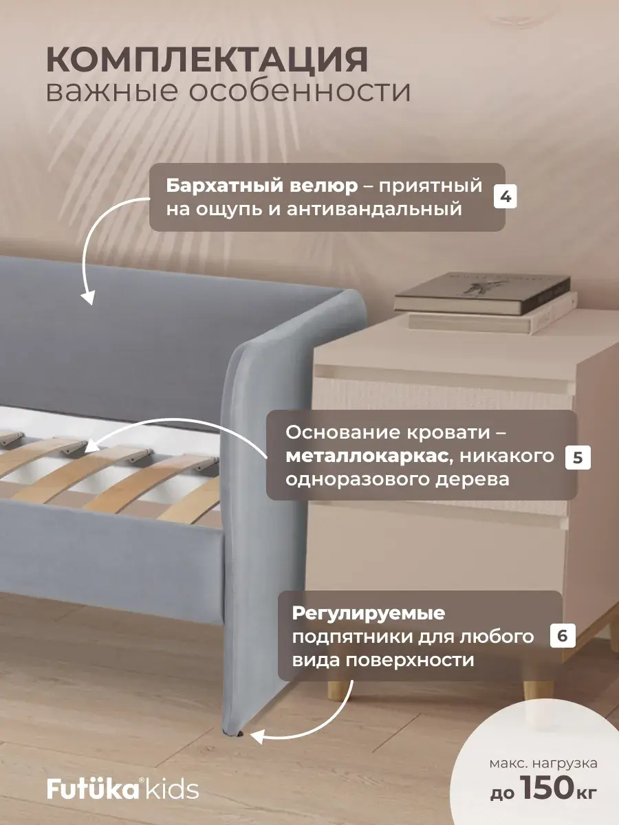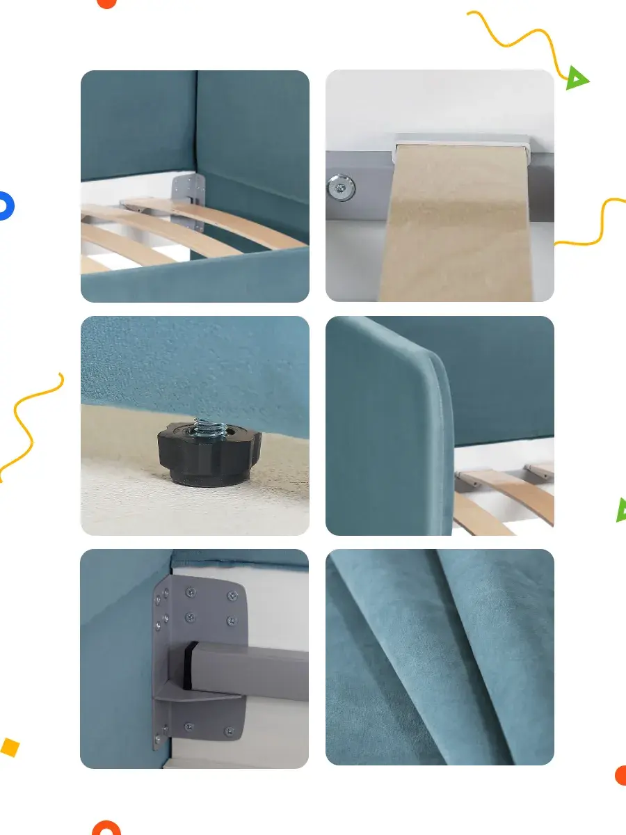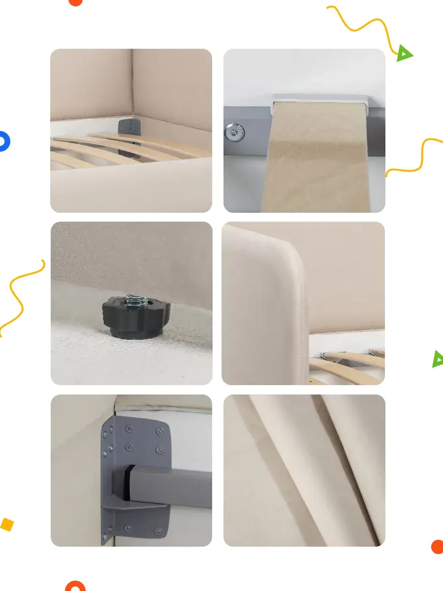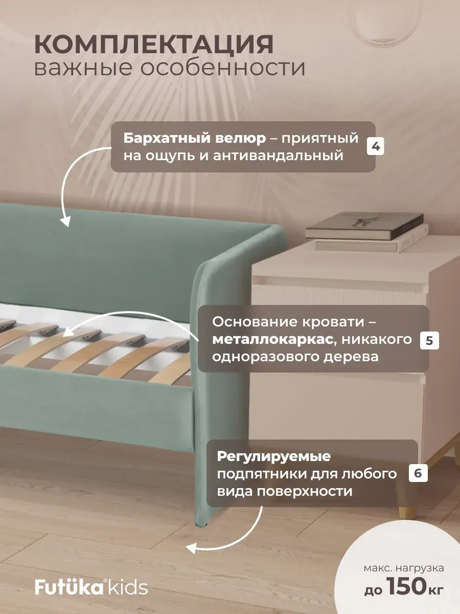 Кровать оснащена ортопедическим основанием из ламелей, которые крепятся на пластиковые держатели антискрип без использования саморезов. Это обеспечивает более надежную фиксацию и предотвращает скрип при использовании дивана-кровати и отличную вентиляцию матраса, позволяя ему дышать и сохранять свежесть на протяжении всего срока службы. Диван-кровать имеет металлический каркас. Преимущество такого каркаса заключается в его прочности и долговечности. Он обеспечивает стабильность и устойчивость мебели, даже при ежедневном использовании и высоких нагрузках. Это гарантирует сохранение формы и размеров на протяжении многих лет, что позволяет сэкономить на дополнительных вложениях в мебель. Еще одно бесспорное преимущество: возможность приобретения ящика для белья и игрушек. Ящик для белья можно с легкостью превратить в дополнительное спальное место. Для этого нужно только доукомплектовать ящик матрасом нужного размера. Каркас и дно ящика изготовлены из ЛДСП класса эмиссии Е-0,5. Это обеспечивает прочность конструкции.